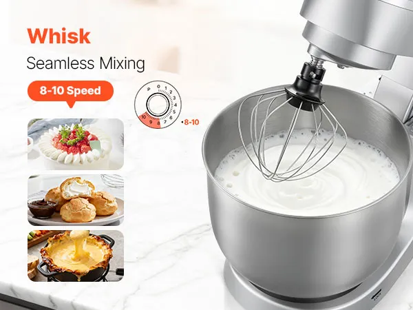 Control de 10 velocidades: Nuestra batidora eléctrica cuenta con un potente motor de 1500 W para una mezcla rápida y uniforme. Diez velocidades ajustables garantizan resultados óptimos: de la 1 a la 6 para masas, de la 1 a la 7 para rellenos y de la 8 a la 10 para montar nata. Detenga la máquina antes de cambiar la velocidad