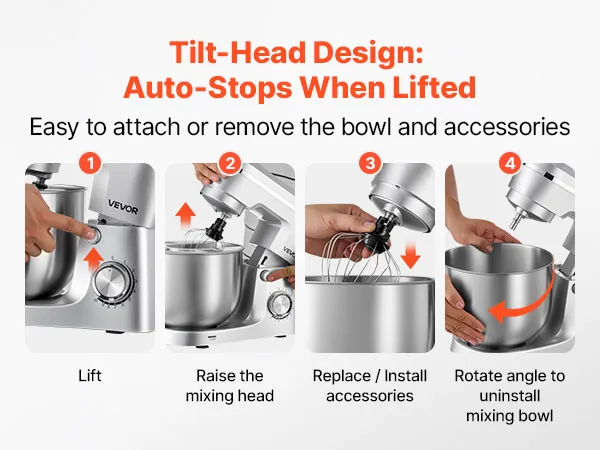 Fácil de desmontar y limpiar: El cabezal se detiene automáticamente al levantarlo, lo que permite colocar y quitar fácilmente los accesorios de mezcla. Para desmontarlo, basta con girar y levantar el bol. Los accesorios, que incluyen el bol, el gancho y la varilla, están fabricados en acero inoxidable apto para uso alimentario y se pueden lavar en el lavavajillas