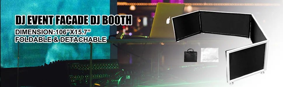 La cabina de DJ está construida con un marco de metal duradero y una tela de poliéster 210 T con tela negra y blanca. Medición de panel central de 33,9" x 15,7", tamaño de panel lateral de 19,3" x 15,7". La cubierta ligera de la cabina de DJ es plegable y desmontable para crear la cabina del tamaño perfecto para adaptarse a su espacio.
