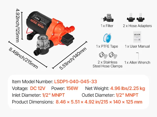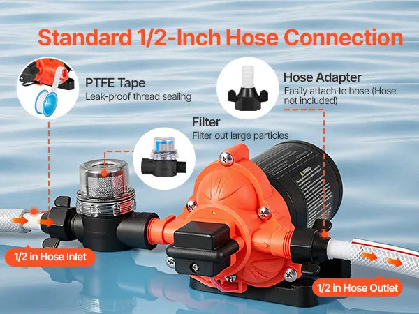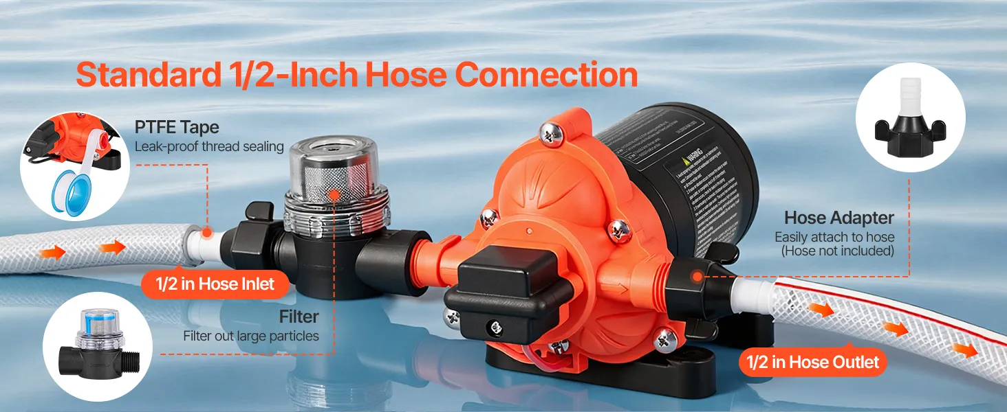 Conexión de manguera de 1/2 pulgada: Equipada con un adaptador de manguera, nuestra bomba de diafragma se conecta rápidamente a cualquier manguera estándar de 1/2 pulgada. Las abrazaderas de acero inoxidable refuerzan la conexión, la cinta de PTFE mejora el sellado de las roscas para evitar fugas y el filtro bloquea los depósitos gruesos
