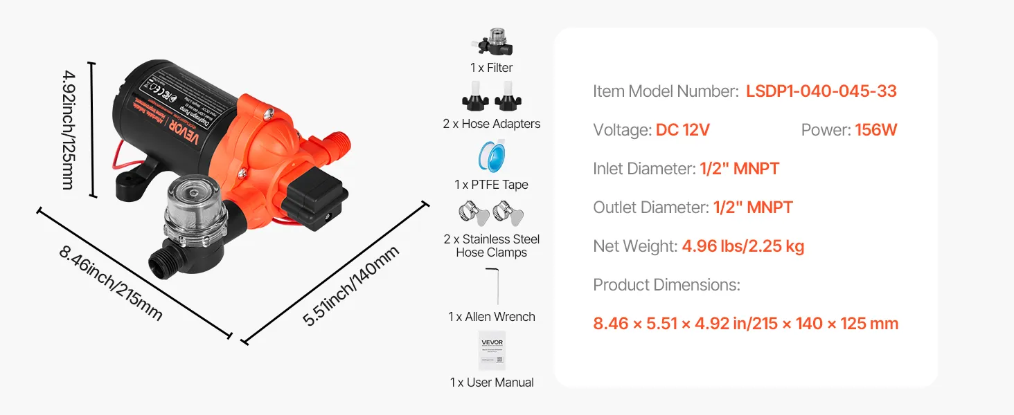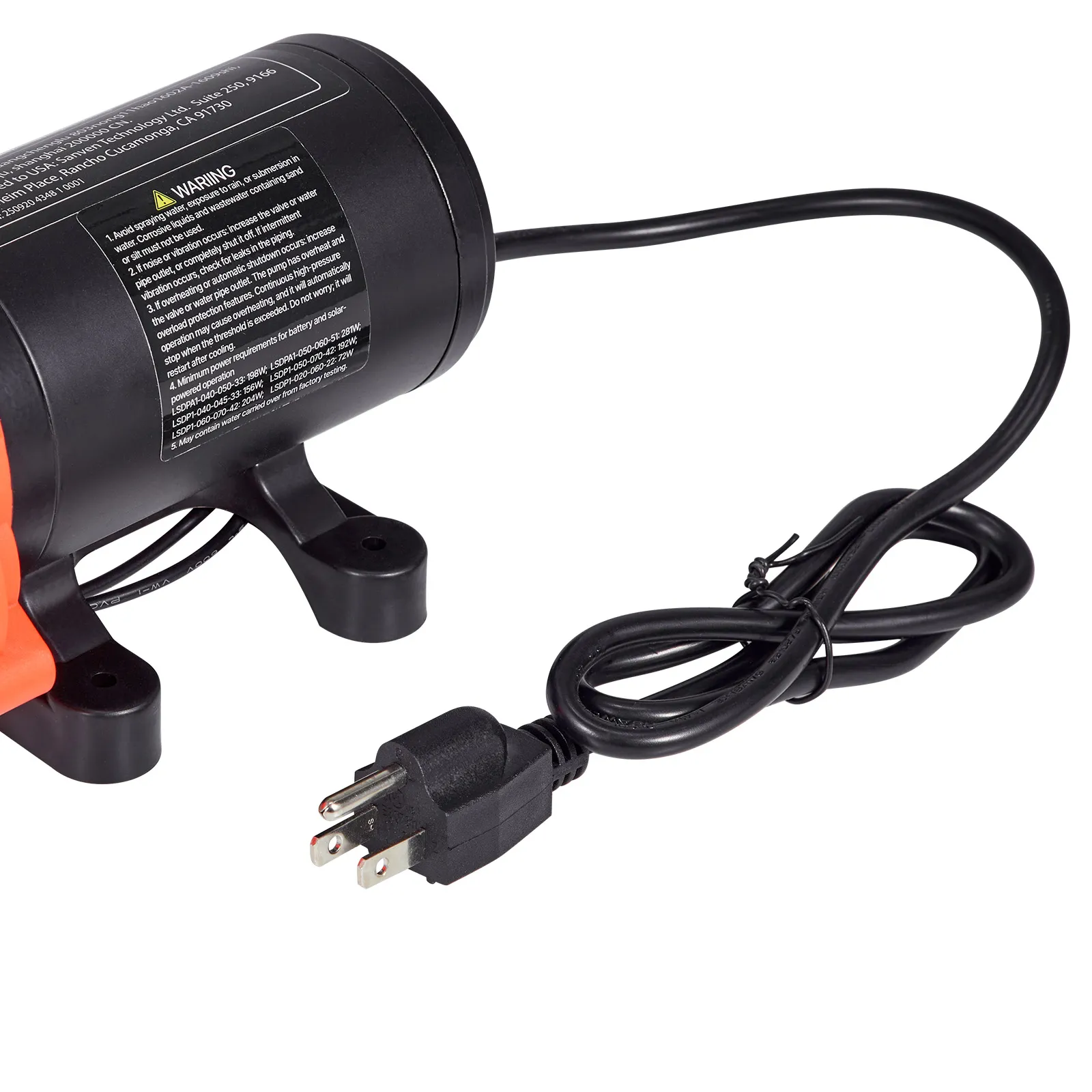 Versátil: Duradera y equipada con protección contra sobrecalentamiento y sobrecarga, nuestra bomba de agua de diafragma controlada por demanda es ideal para vehículos recreativos, caravanas, camiones de comida, riego de jardines, aspersores, barriles de agua de lluvia, etc. Nota: No es resistente al agua, no apto para uso en exteriores
