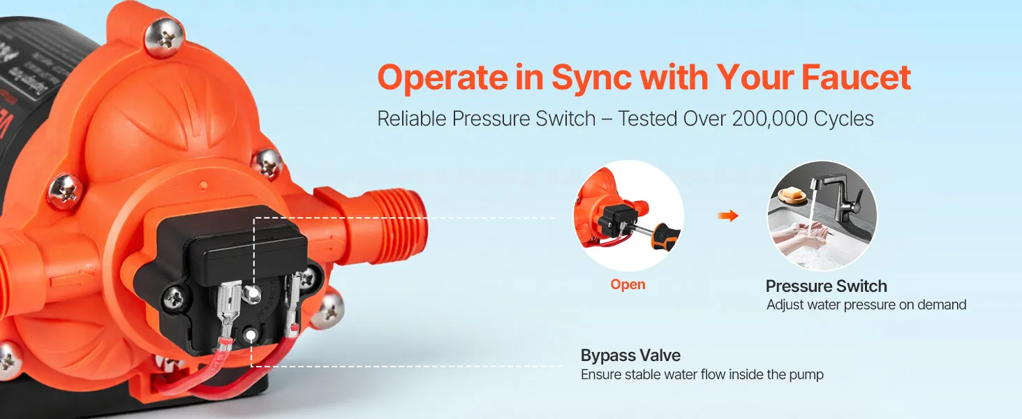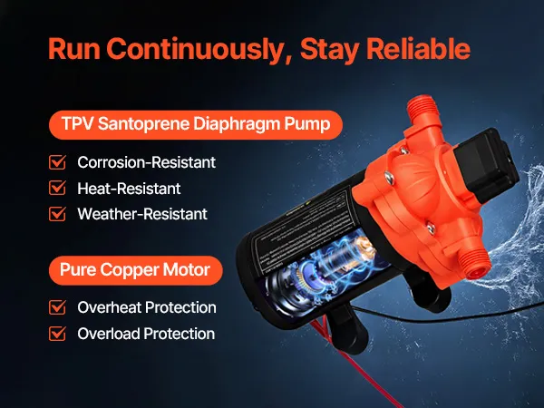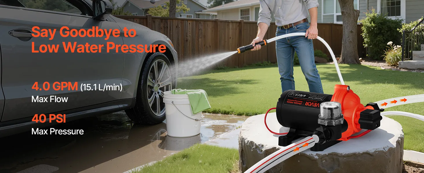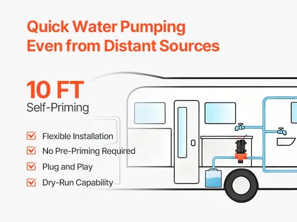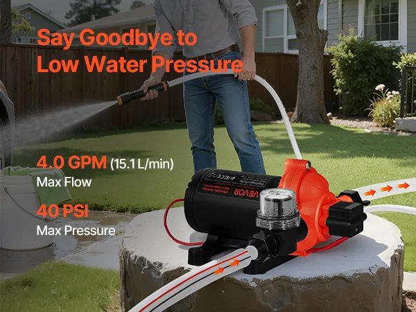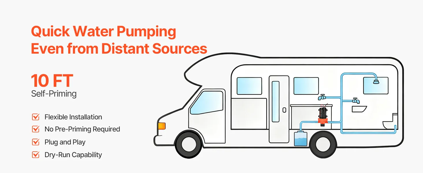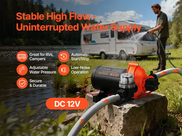 Bomba de alto rendimiento de 15,1 L/min: Nuestra potente bomba de diafragma de 12 V ofrece un caudal máximo de 15,1 L/min, una presión máxima de 2,75 bar y una altura de carga autocebante de 3 m. Extraiga agua rápidamente de tanques remotos sin necesidad de cebar; admite arranques cortos en seco