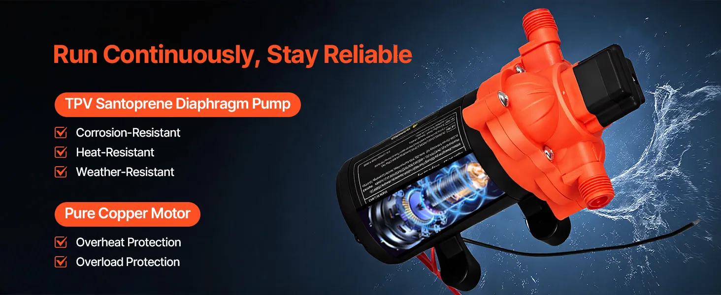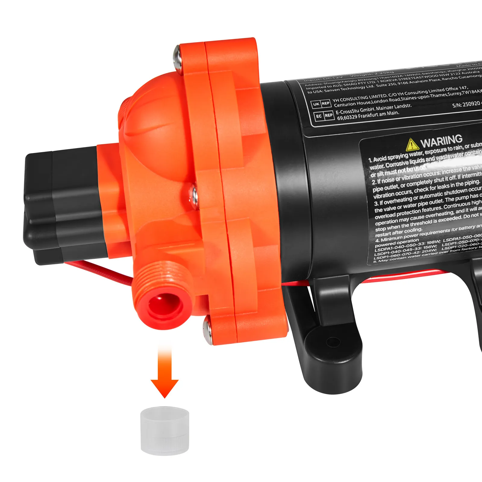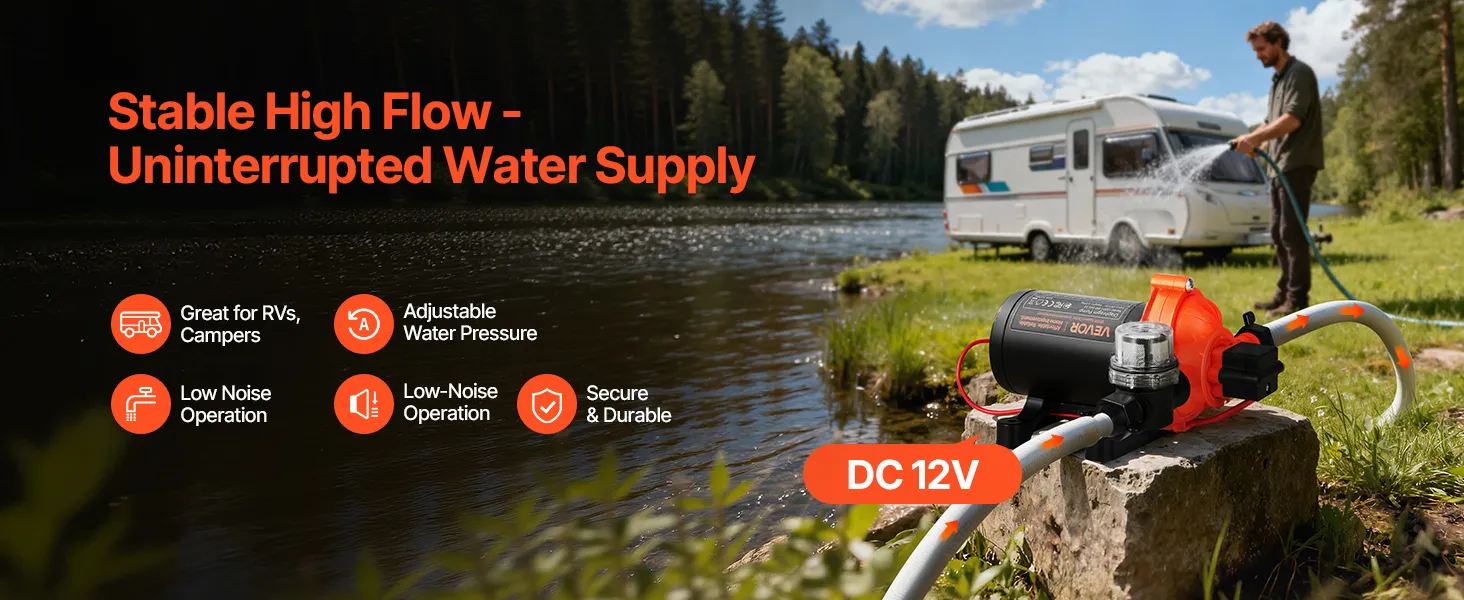 Bomba de alto rendimiento de 15,1 L/min: Nuestra potente bomba de diafragma de 12 V ofrece un caudal máximo de 15,1 L/min, una presión máxima de 2,75 bar y una altura de carga autocebante de 3 m. Extraiga agua rápidamente de tanques remotos sin necesidad de cebar; admite arranques cortos en seco
