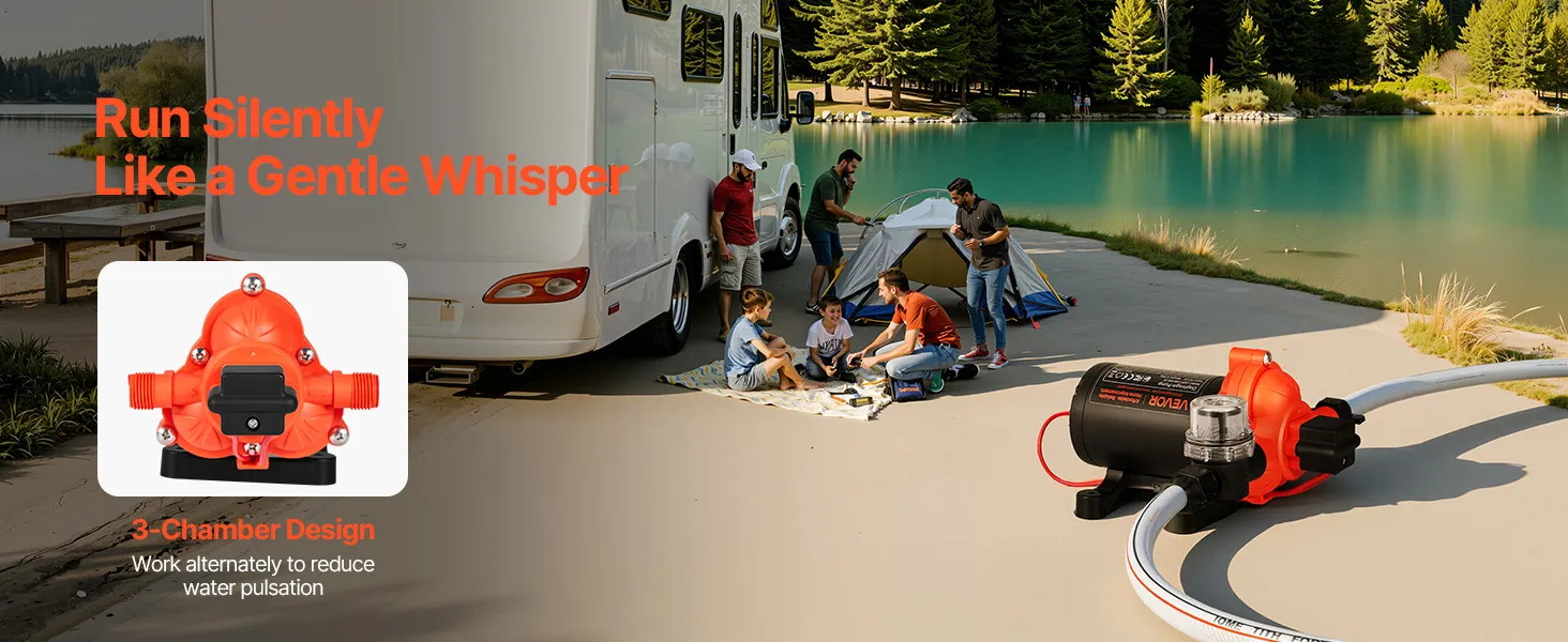VEVOR Bomba de Diafragma, 12 V DC, 15,1 L/min, Autocebante, de 3 Cámaras con Presostato Automático, Presión de 2,75 Bar, para Autocaravanas, Caravanas, Barcos, Yates y Lavaderos de Coches, 156 W