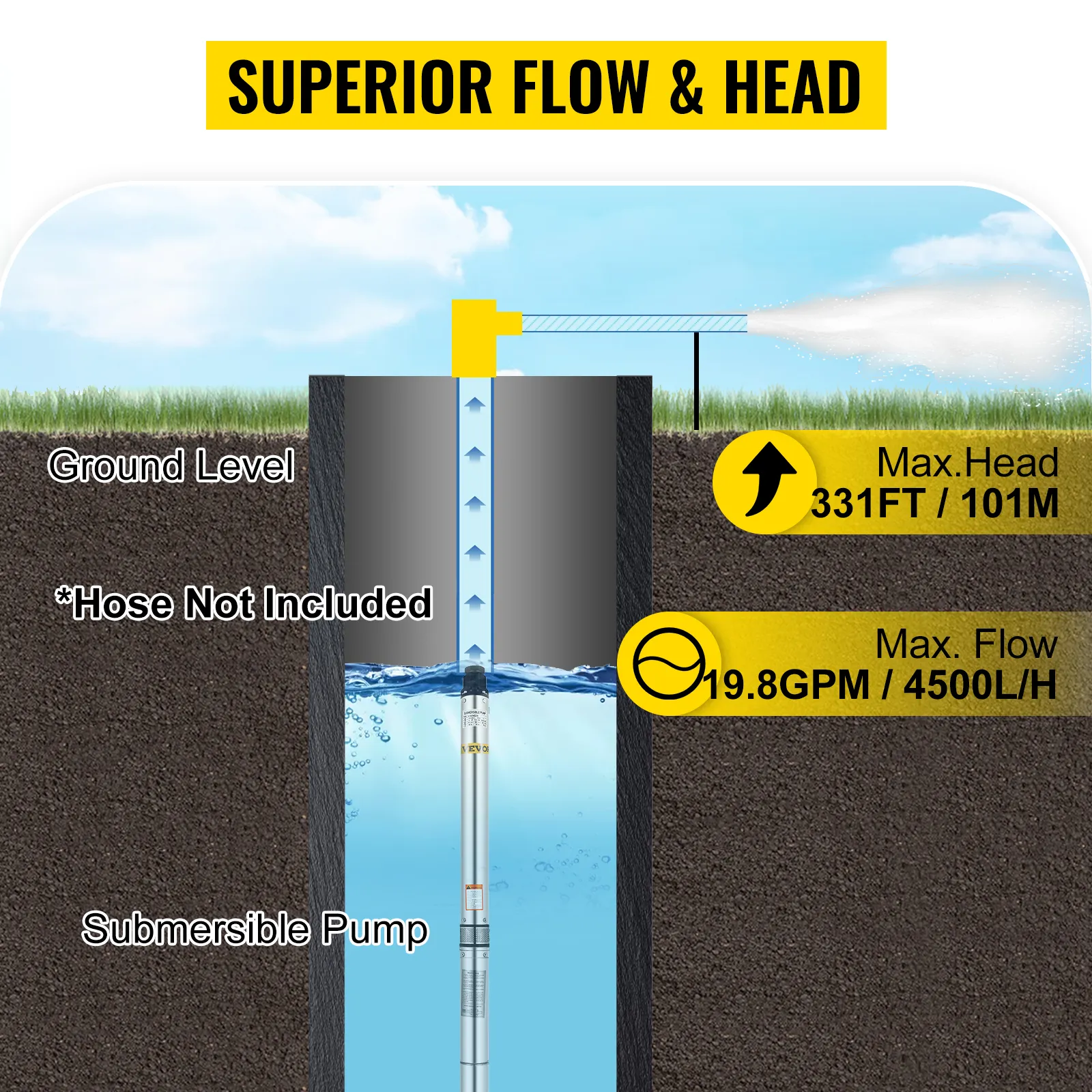 El caudal máximo de la bomba sumergible para pozos es de 19,8 GPM, y la altura más alta es de 331 pies, lo que le proporciona mayores requisitos de bombeo. Además, el impulsor de acero proporciona un gran flujo y elevaciones para que usted obtenga un mejor rendimiento de la bomba.