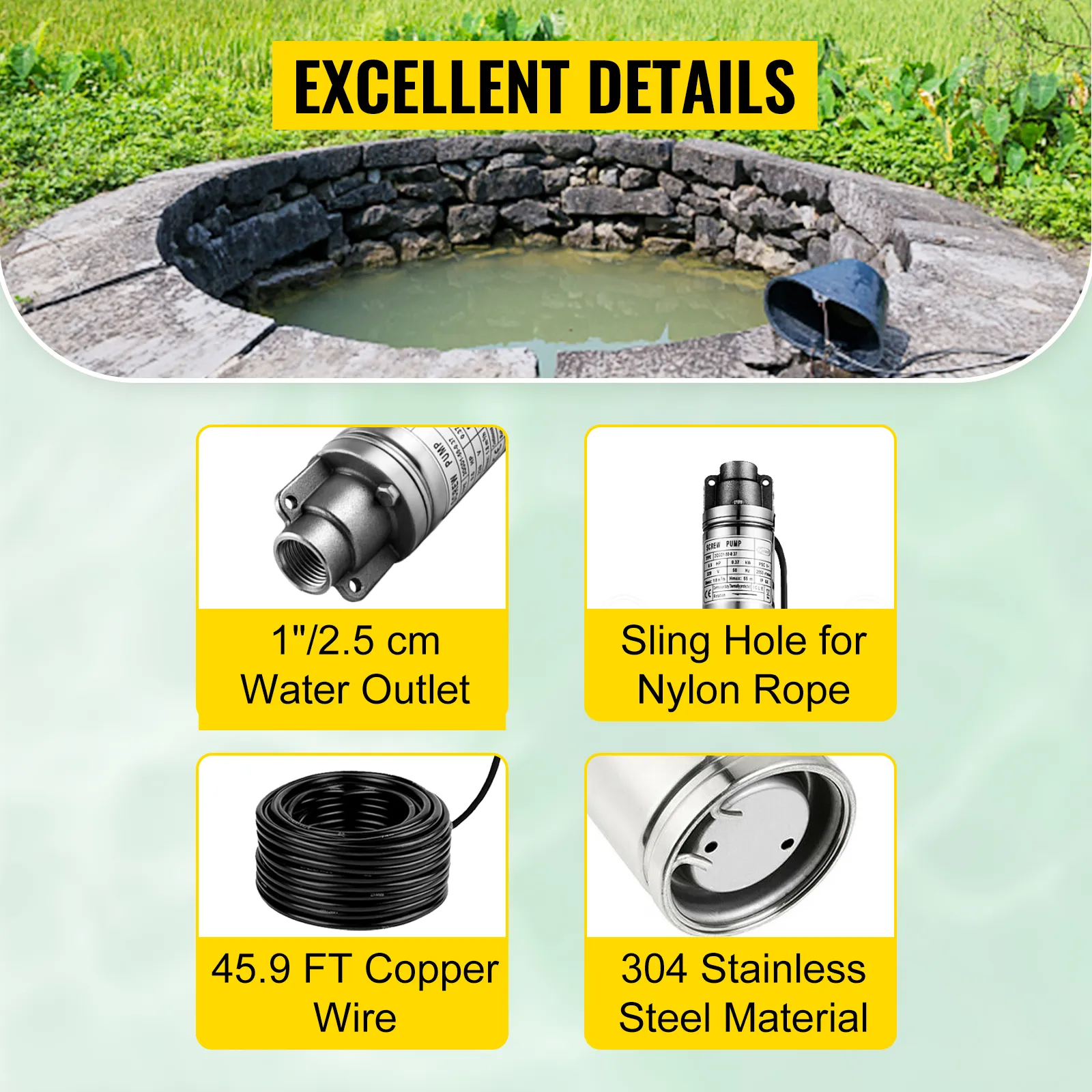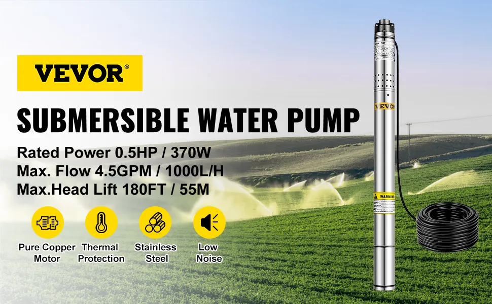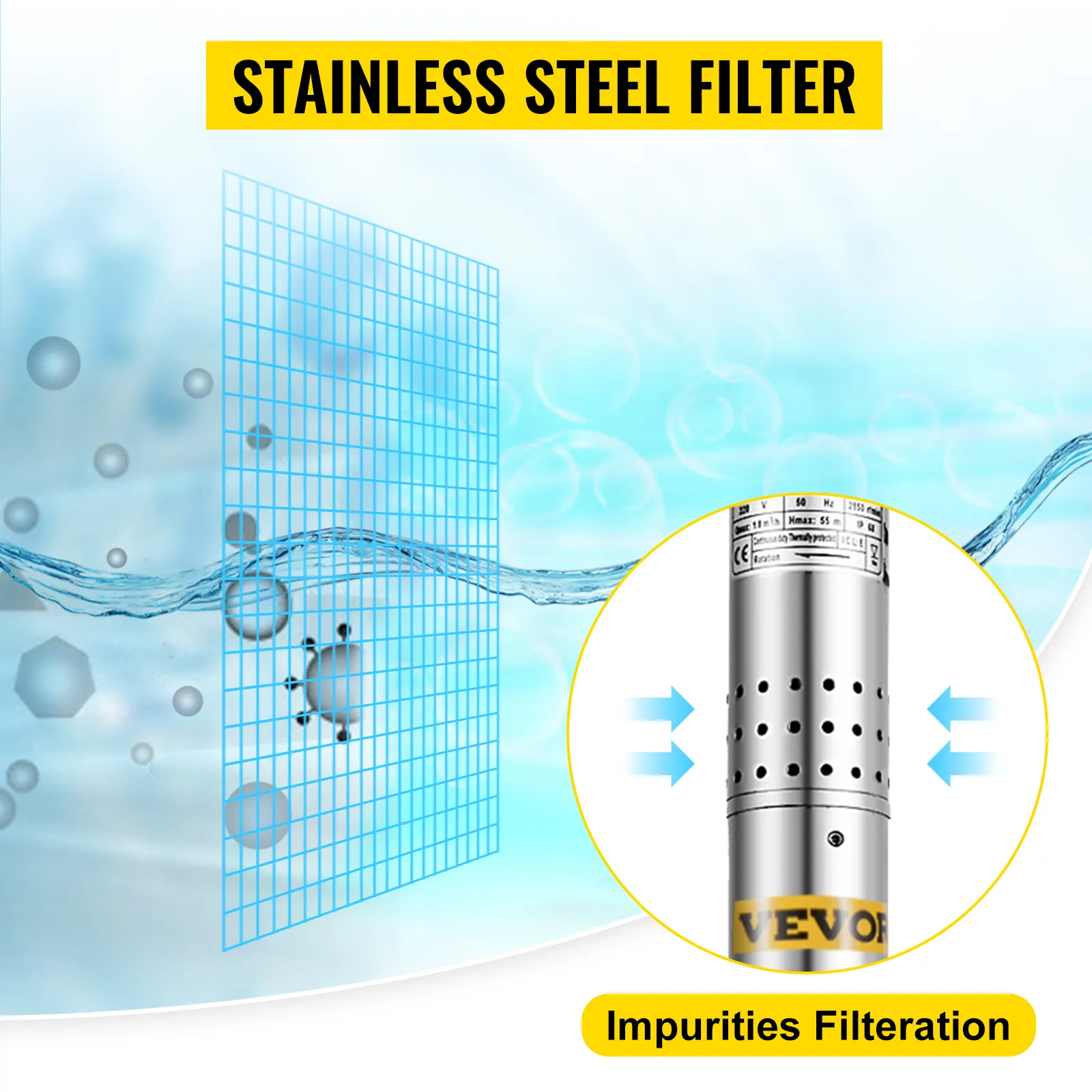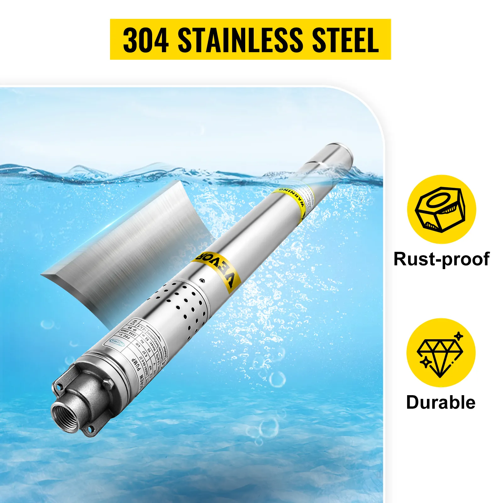 - Esta bomba sumergible, fabricada en acero inoxidable 304, es una bomba de pozo duradera que le servirá durante un par de años. Además, esta bomba para pozos profundos le proporciona un caudal avanzado, produciendo un flujo constante hasta bastante profundidad bajo la superficie. Con esta bomba de pozo profundo, podrá obtener agua de forma rápida y cómoda incluso desde grandes profundidades.