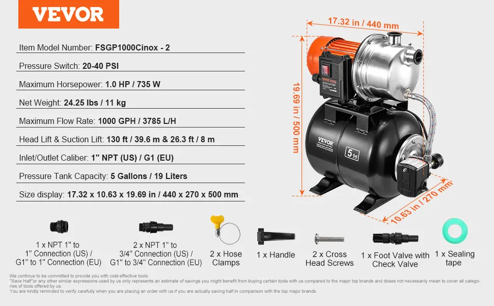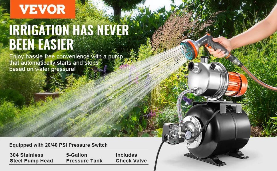 Bomba para pozos poco profundos VEVOR de 1 HP con tanque de presión, 1000 GPH, bomba de refuerzo de agua de riego automática con elevación de cabezal de 130 pies, interruptor de presión de 20/40 PSI, cabezal de bomba de acero inoxidable 304 para césped de jardín doméstico