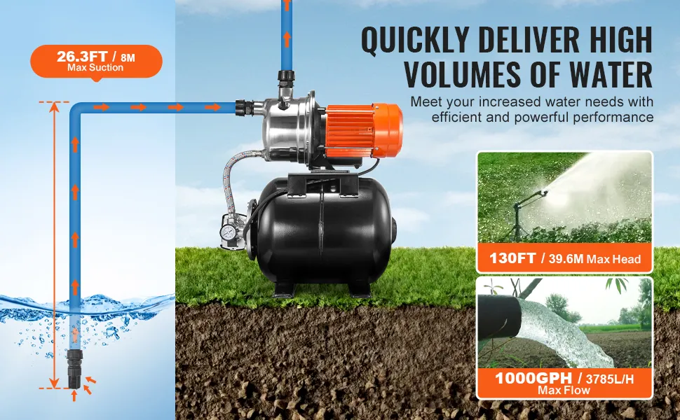 Con una altura máxima de 130 pies (39,6 m) y un caudal de 1000 GPH (3785 L/H), esta bomba con tanque de presión maneja de manera eficiente el transporte de agua a larga distancia. La elevación por succión de 26,3 pies (8 m) permite la extracción de agua de pozos o fuentes más profundas.