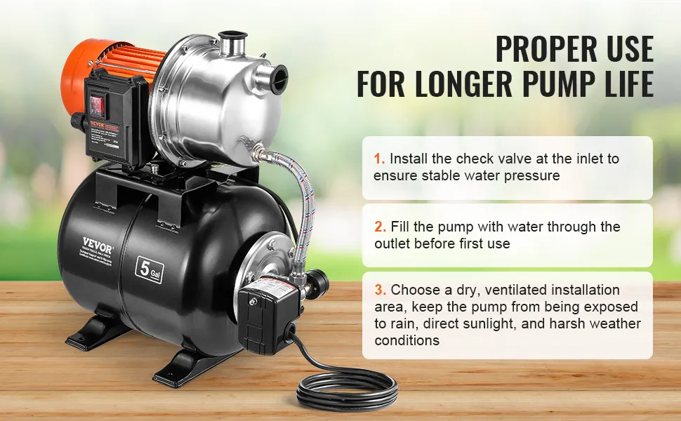 Accesorios diseñados cuidadosamente: para evitar el reflujo y mantener una presión de agua estable, incluimos una válvula de retención con la bomba para pozos poco profundos. Esto garantiza una instalación sin complicaciones: simplemente conecte las mangueras y comience a usar la bomba de inmediato. (Nota: la primera vez que la use, asegúrese de llenar la bomba con agua a través del puerto de descarga para evitar daños por funcionamiento en seco).