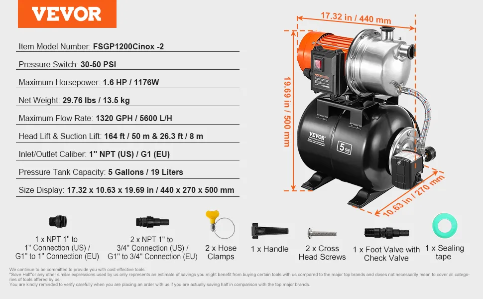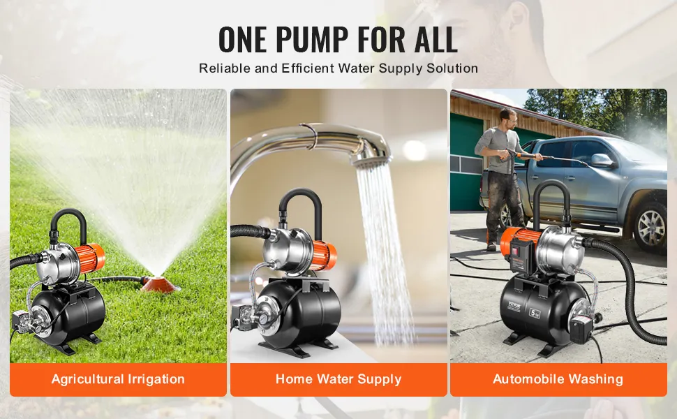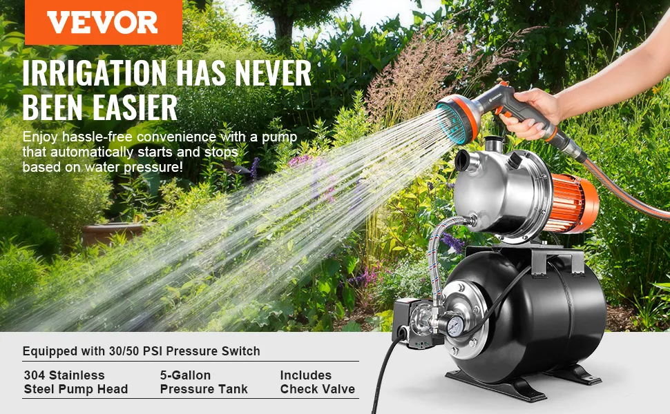 Bomba para pozos poco profundos VEVOR de 1,6 HP con tanque de presión, 1320 GPH, bomba de refuerzo de agua de riego automática con tanque de presión de 5 galones, interruptor de presión de 30/50 PSI, cabezal de bomba de acero inoxidable para césped de jardín doméstico