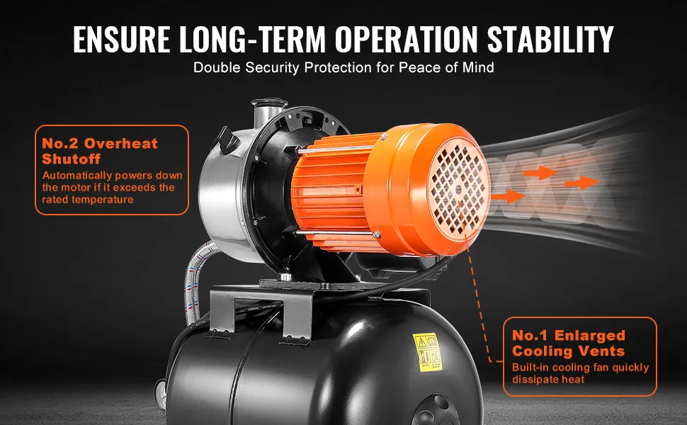 Diseñada con amplios orificios de ventilación y un ventilador incorporado, esta bomba para pozos poco profundos con tanque garantiza una rápida disipación del calor durante el funcionamiento. El apagado automático protege el motor contra el sobrecalentamiento.