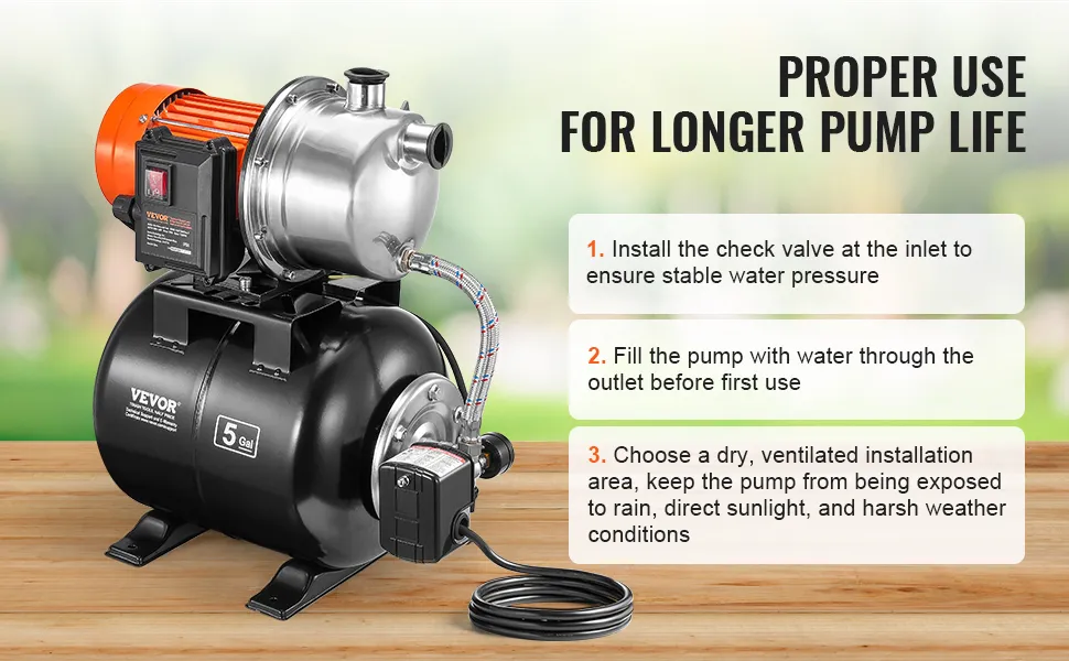 Accesorios diseñados cuidadosamente: para evitar el reflujo y mantener una presión de agua estable, incluimos una válvula de retención con la bomba para pozos poco profundos. Esto garantiza una instalación sin complicaciones: simplemente conecte las mangueras y comience a usar la bomba de inmediato. (Nota: la primera vez que la use, asegúrese de llenar la bomba con agua a través del puerto de descarga para evitar daños por funcionamiento en seco).