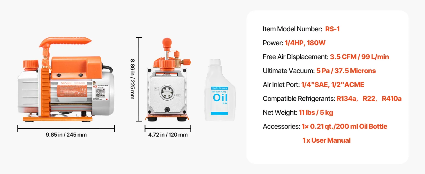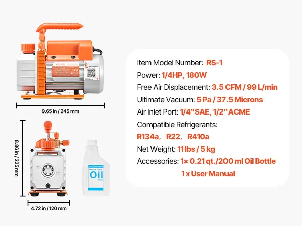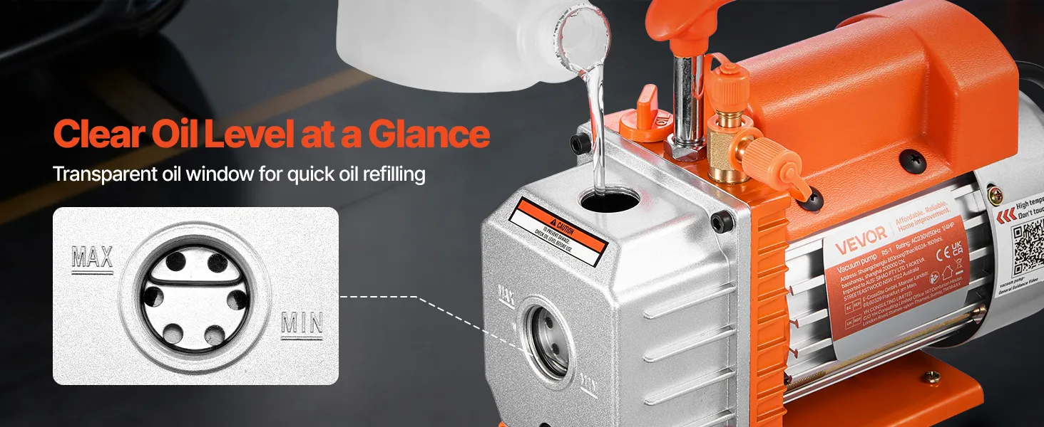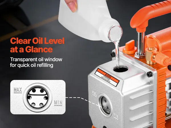 Diseño fácil de usar: Gracias a su capacidad de 200 ml de aceite y a su ventana transparente, comprobar el nivel de aceite es muy sencillo. Esta bomba de vacío para aire acondicionado incluye una botella de 200 ml de aceite lista para usar