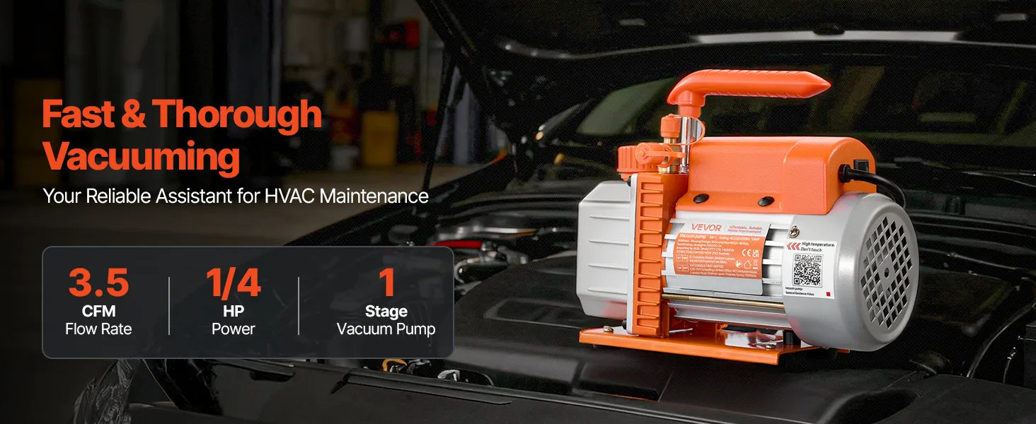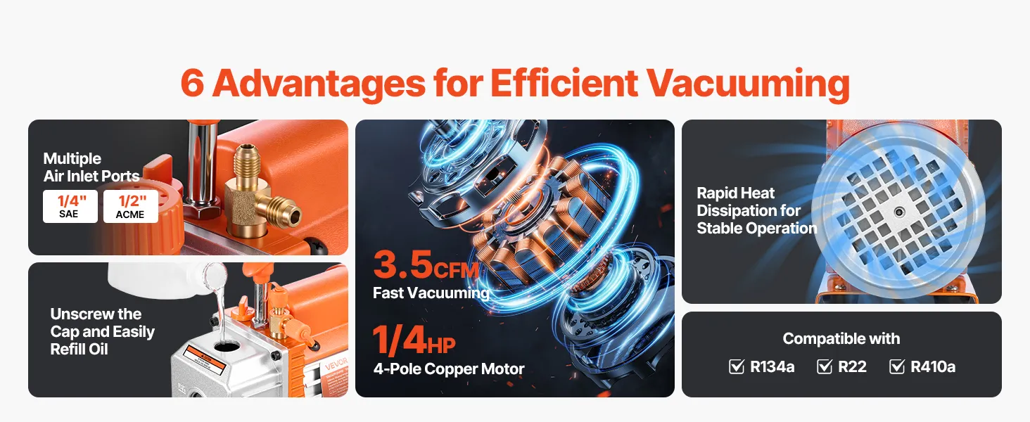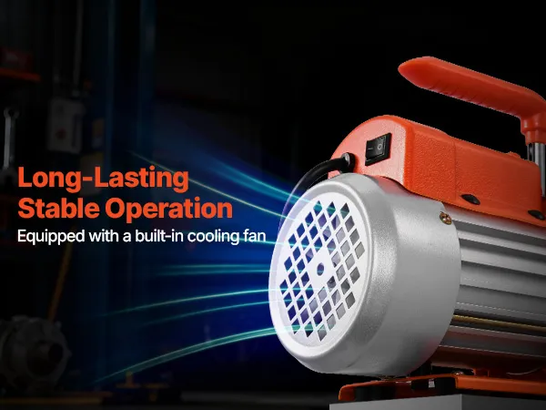 Funcionamiento estable y fiable: Equipada con un motor de 4 polos de alto par, esta bomba de vacío para sistemas de calefacción, ventilación y aire acondicionado (HVAC) funciona de forma eficiente durante largos periodos. Su carcasa de hierro fundido y aluminio fundido a presión, con ventilador de refrigeración integrado, evita el sobrecalentamiento y garantiza un rendimiento estable