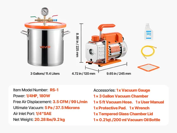 VEVOR Bomba de Vacío de 3,5 CFM 99 L/min, Cámara de Vacío de Acero Inoxidable de 11,4 L, con Tapa de Vidrio Templado, Botella de Aceite de 200 ml y Manguera de 1,5 m, Para Estabilización de Madera