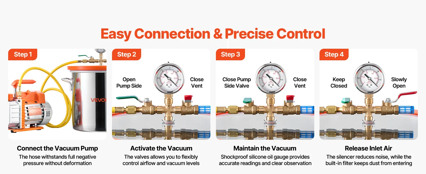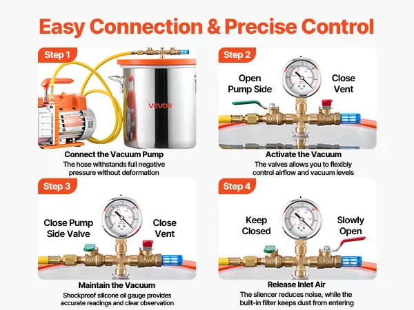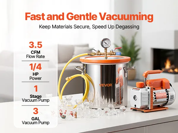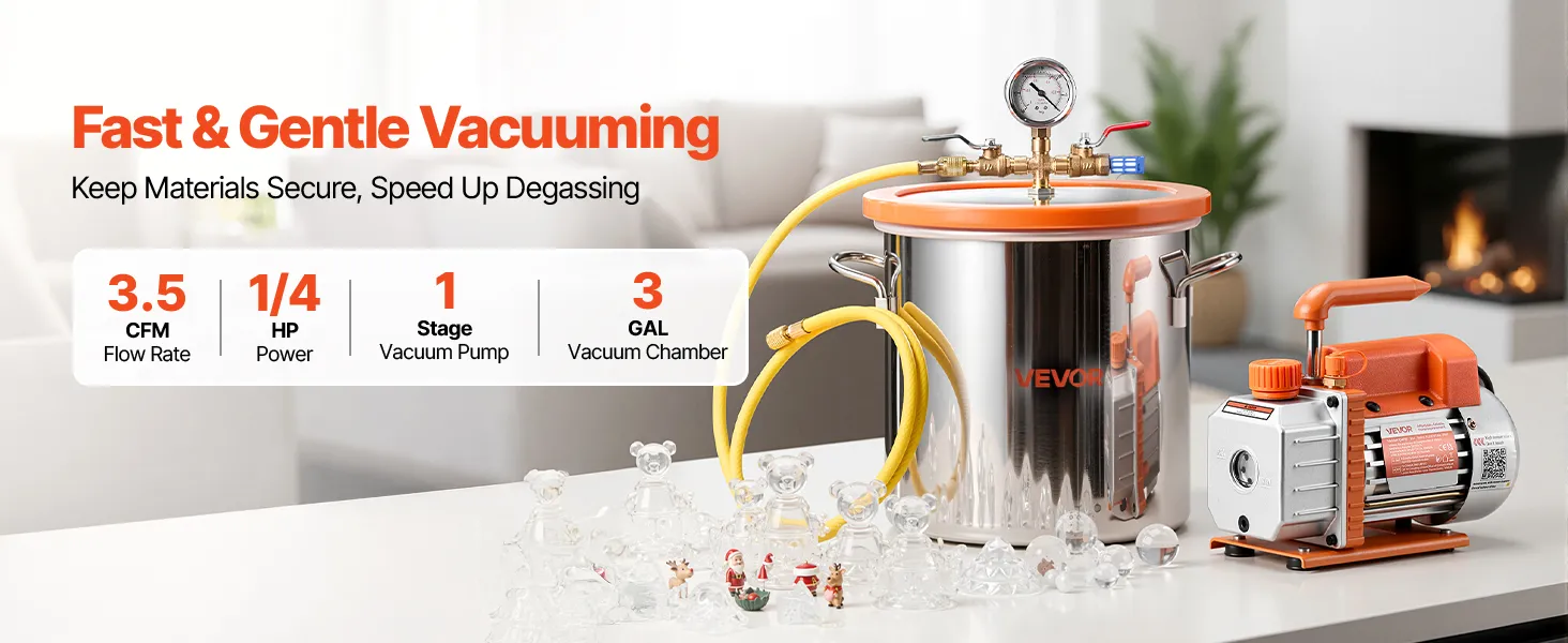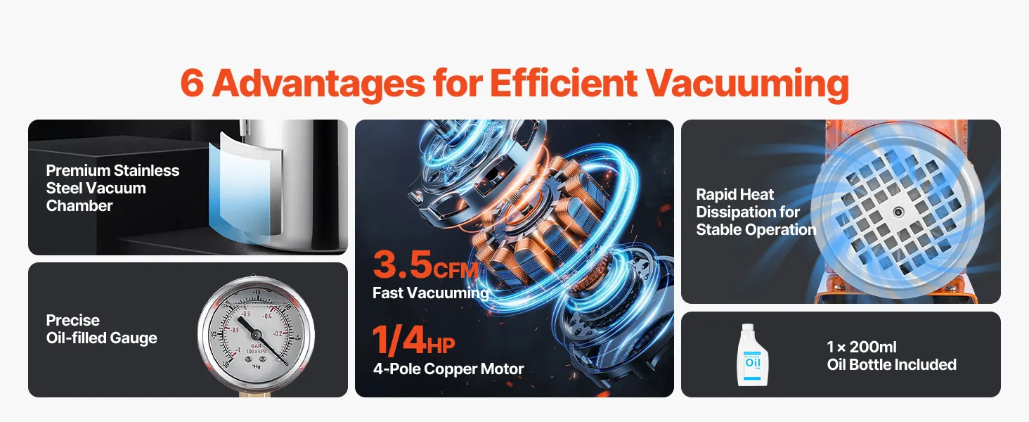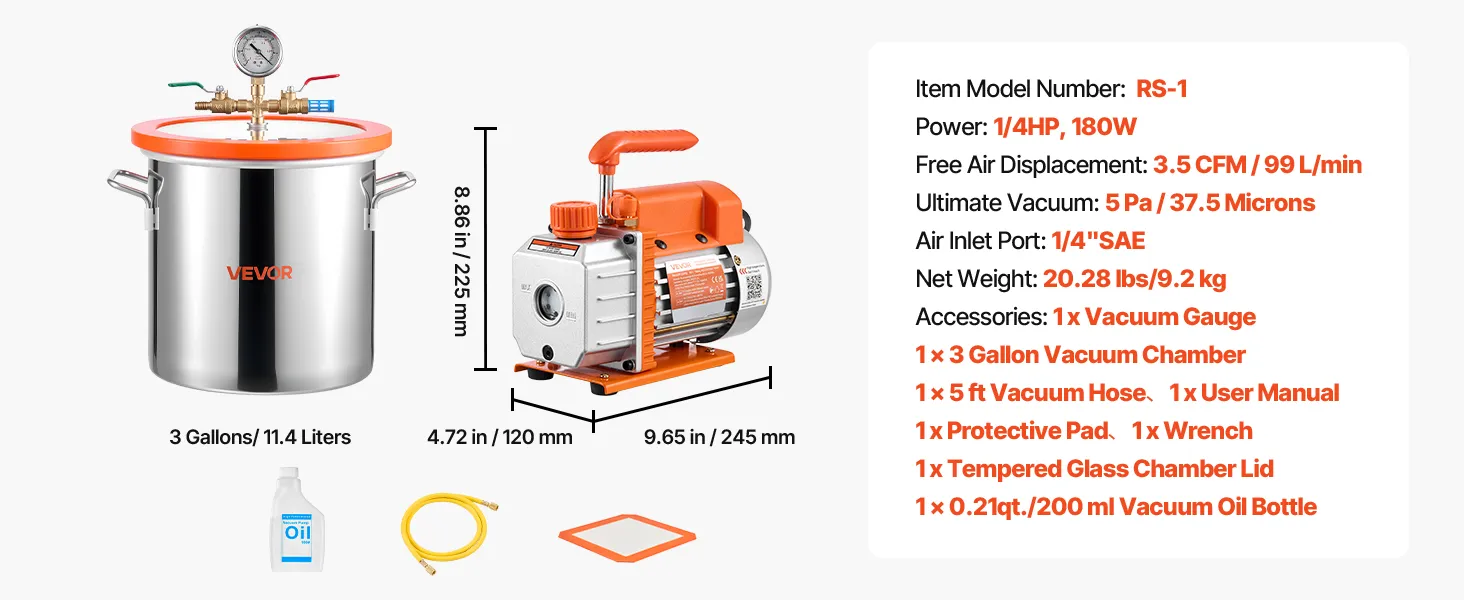 Kit completo todo en uno: Incluye todo lo necesario: bomba de vacío, cámara de vacío de 11,4 L, tapa de vidrio templado, manómetro, manguera de 1,5 m, funda protectora y botella de 200 ml de aceite de vacío. Listo para usar al instante