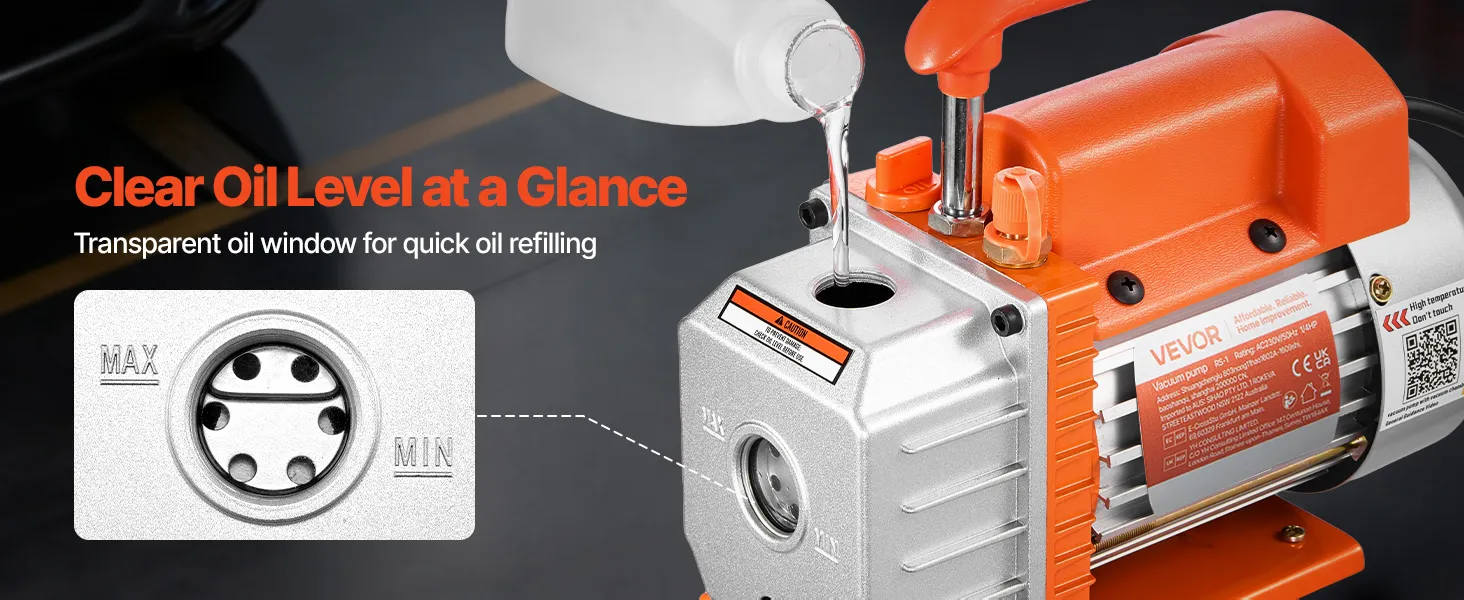 Diseño intuitivo: Disfrute de un manejo sencillo gracias a su empuñadura ergonómica de goma que proporciona un agarre cómodo. La ventana transparente con indicador de nivel de aceite facilita el mantenimiento: compruebe el nivel de aceite de un vistazo. Garantice el funcionamiento óptimo de su bomba de vacío sin esfuerzo