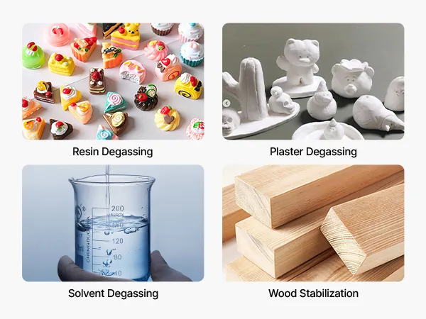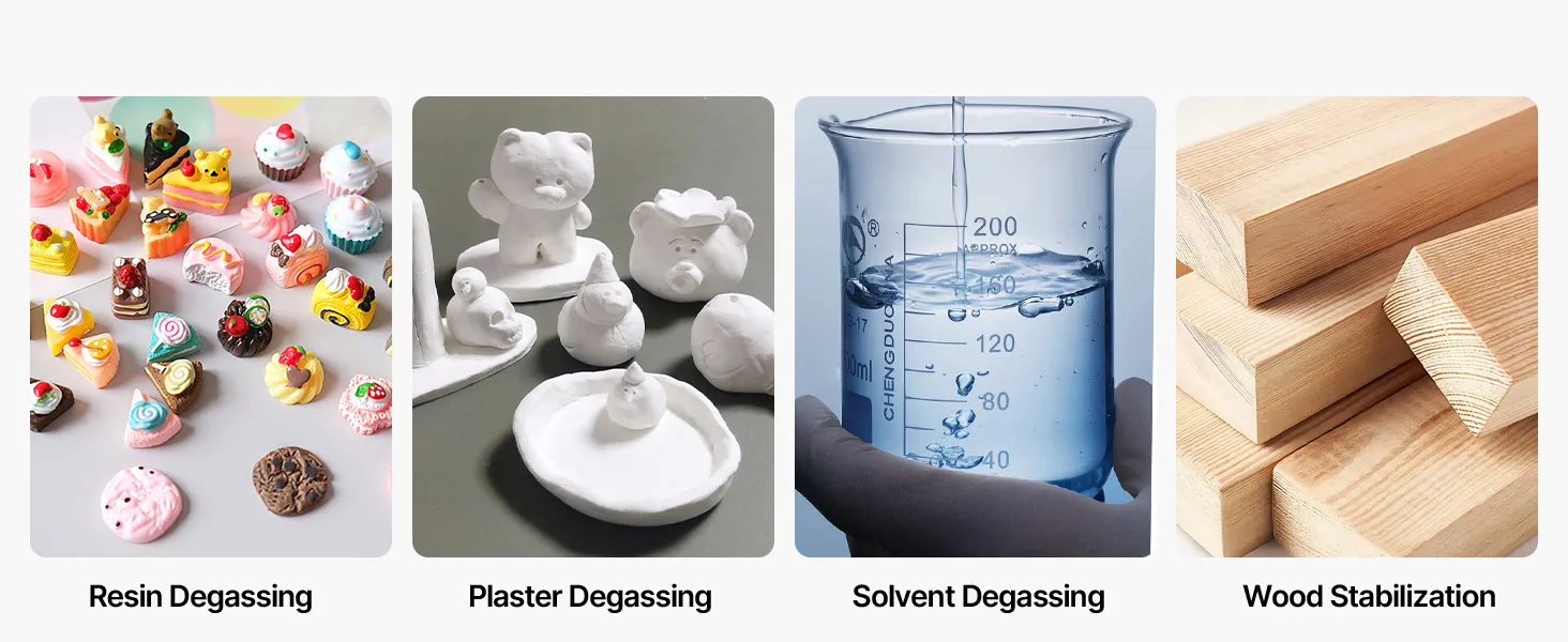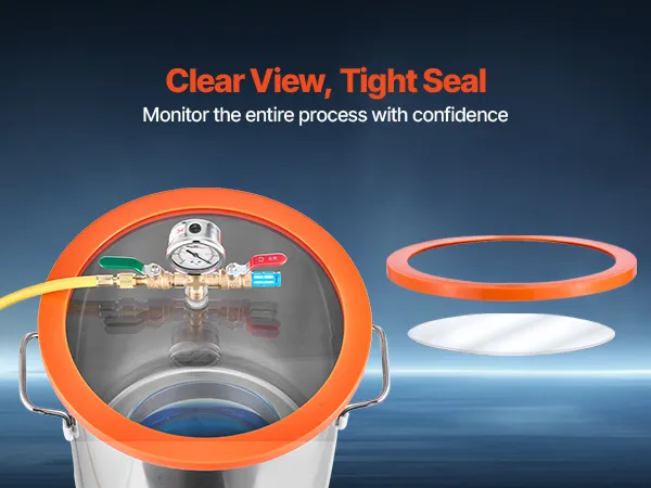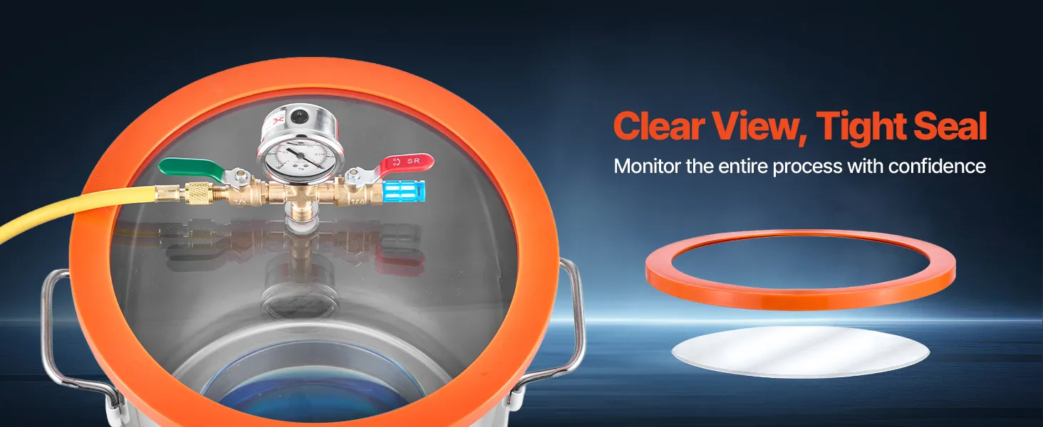 Cámara de vacío de 11,4 L: Fabricada en acero inoxidable de alta calidad, esta cámara de vacío soporta altas presiones sin deformarse. El manómetro de aceite de silicona garantiza mediciones precisas, mientras que la tapa de vidrio templado permite observar claramente el proceso de desgasificación