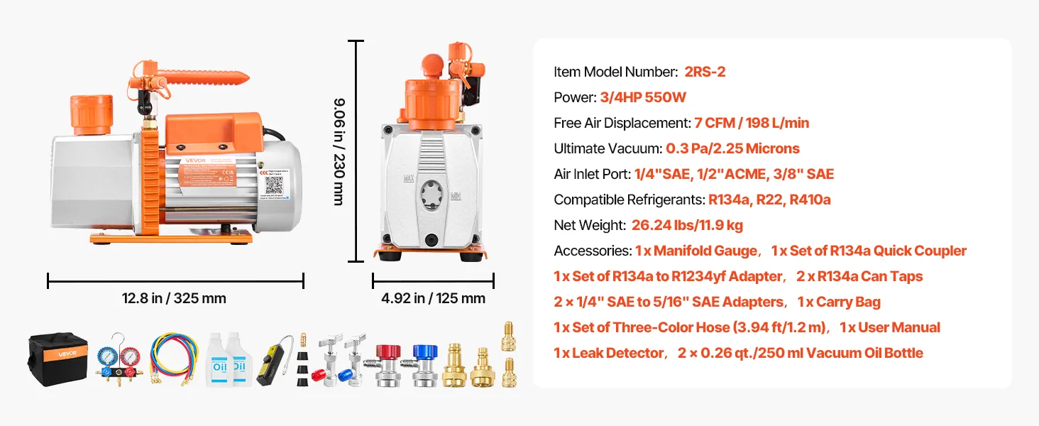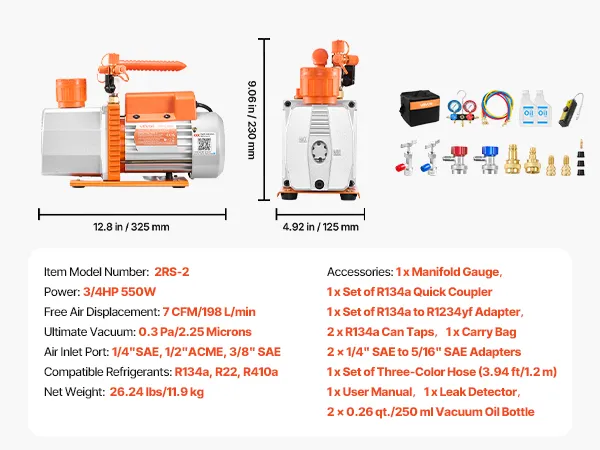 VEVOR Kit de Bomba de Vacío y Manómetro 7 CFM 198 L/min, Bomba de Vacío de Paletas Rotativas de 2 Etapas, Compatible con R134a, R22 y R410a para Aires Acondicionados de Automóviles y Hogares