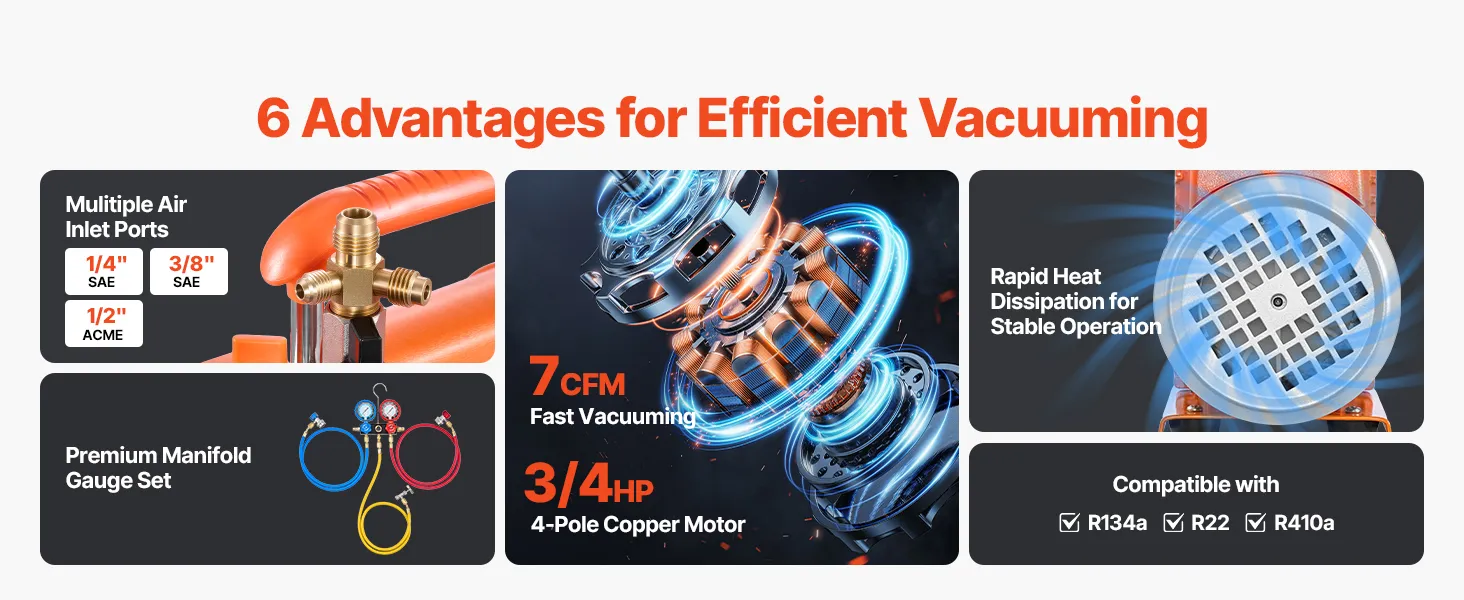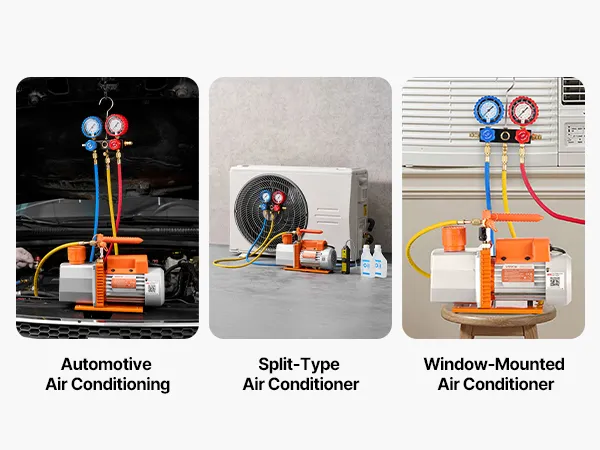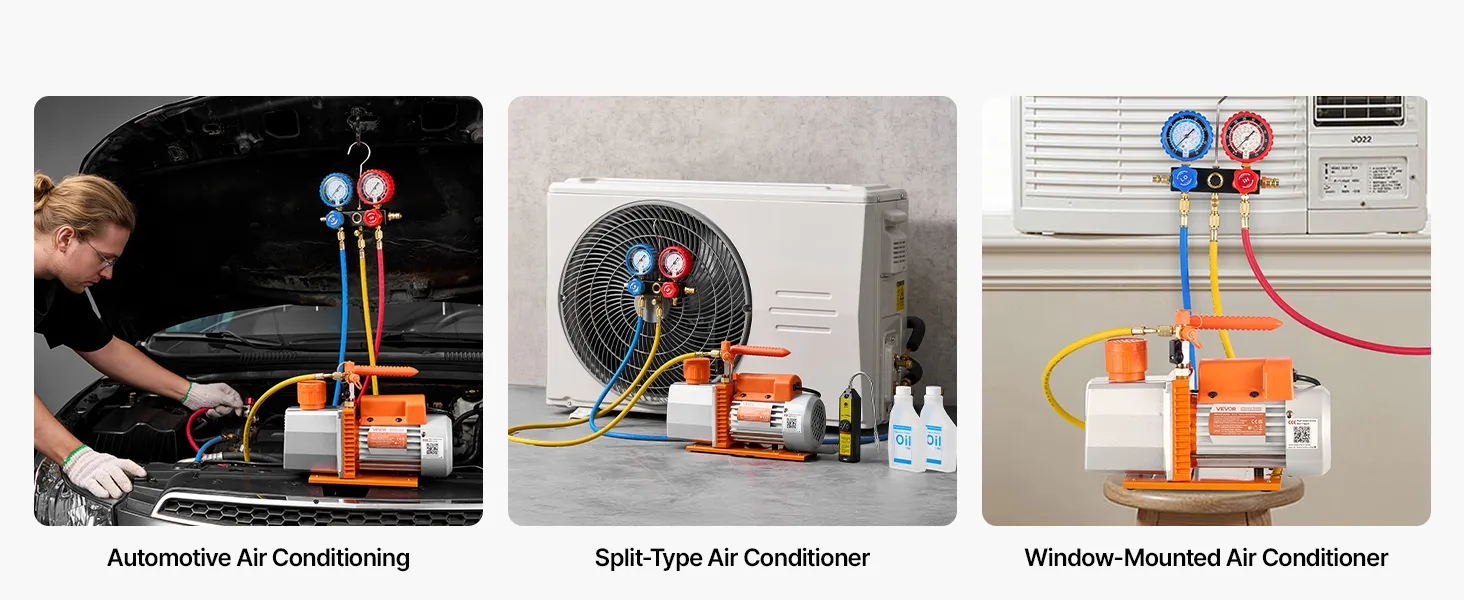 Amplia compatibilidad con refrigerantes: La bomba de vacío es compatible con R134a, R22, R410a y otros refrigerantes comunes no inflamables. Ideal para la reparación de sistemas de aire acondicionado automotriz, el mantenimiento de sistemas HVAC, trabajos de refrigeración y aplicaciones industriales