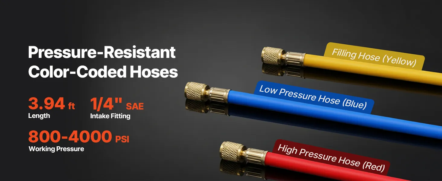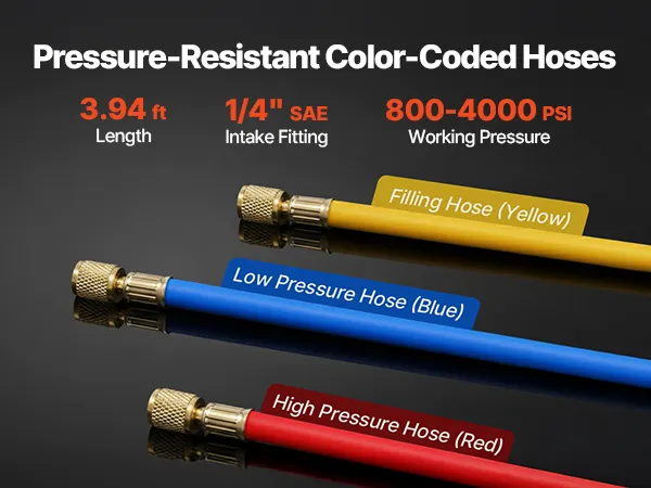 Conexión fiable y segura: Nuestra bomba de vacío para sistemas de calefacción, ventilación y aire acondicionado (HVAC) está equipada con una manguera tricolor de 1,2 m (roja, azul y amarilla) para una rápida identificación y una conexión segura. Soporta una presión de trabajo de 800 a 4000 psi, lo que permite su funcionamiento sin problemas en entornos de alta presión