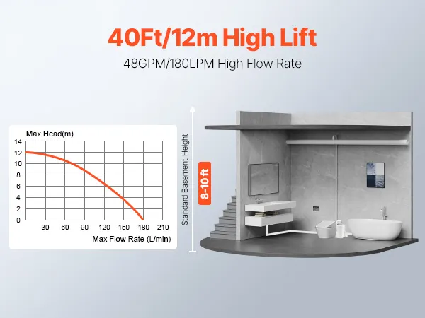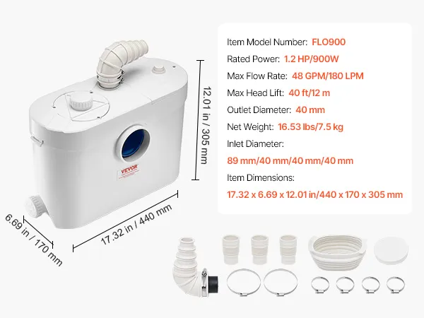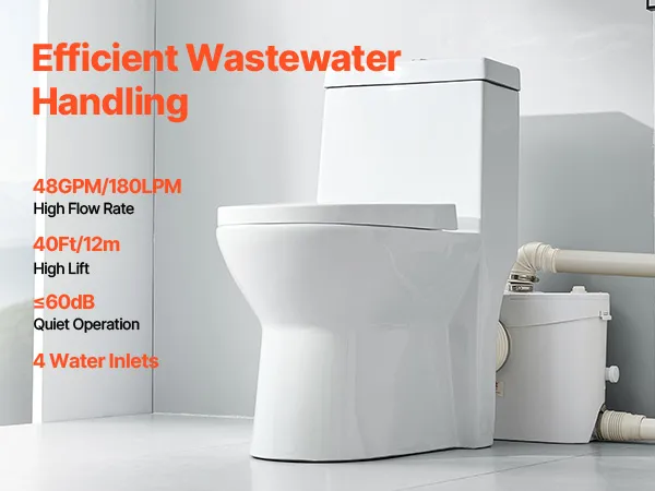 Potente potencia de descarga: Con un motor de 900 W y un caudal de 180 LPM, esta bomba de eliminación de aguas residuales garantiza que su inodoro se mantenga limpio, incluso durante un uso intensivo. Su capacidad de elevación de 12 m drena de manera eficiente las aguas residuales, independientemente de la distribución de su espacio