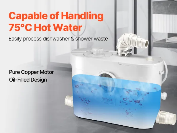 Equipada con un motor de cobre y un diseño lleno de aceite, esta bomba de alcantarillado trituradora maneja aguas residuales de hasta 75 ℃/167 ℉ de lavavajillas y lavadoras con facilidad.