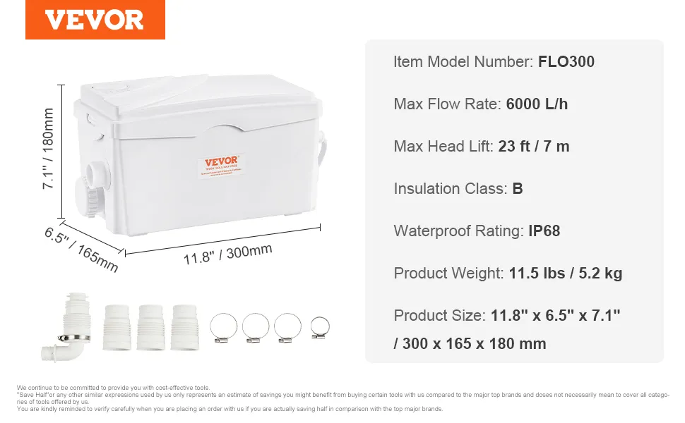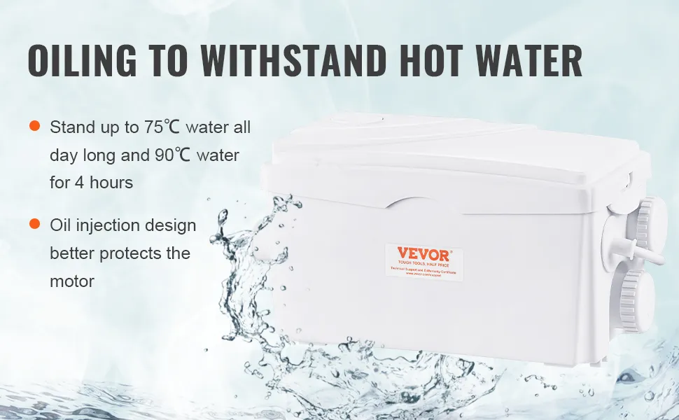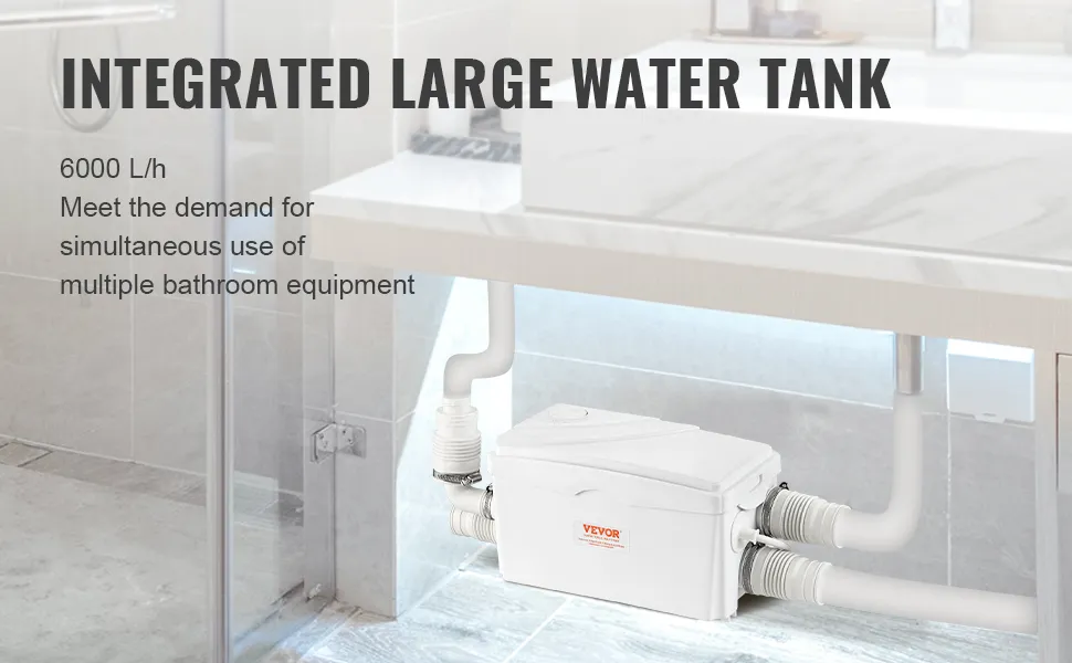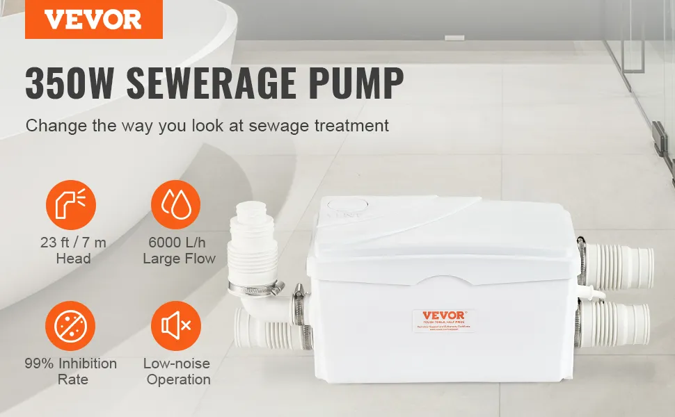 ¿Busca formas de eliminar fácil y rápidamente las aguas residuales? Esta bomba maceradora VEVOR proporciona una altura de 23 pies y un gran flujo de 6000 L/h con un potente motor de cobre de 350 W. Puede agregarla su inodoro, bañera, ducha, lavandería o cocina