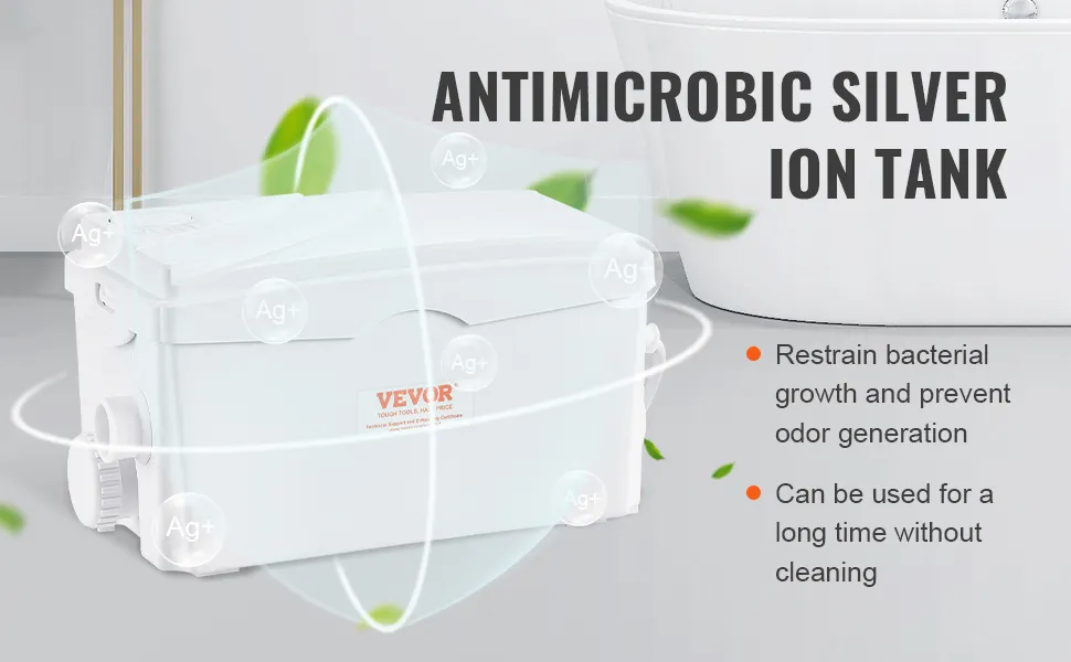 Propiedad antimicrobiana eficaz: ¡no se preocupe por los olores después de un uso prolongado! Un tanque de agua de iones de plata especialmente diseñado tiene una tasa de inhibición de hasta el 99% y previene eficazmente la generación de olores. ¡Esta bomba de descarga ascendente no requiere mantenimiento, lo que le permite usarla sin dolor de cabeza!