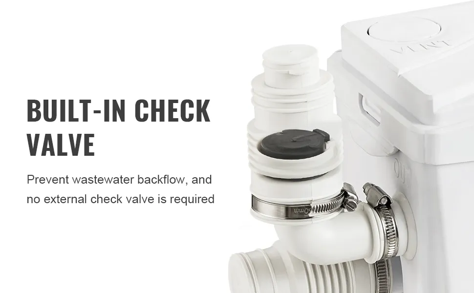 Esta bomba maceradora de aguas residuales tiene un conjunto de codo con una válvula de retención para conectar la salida de agua. Le ayuda a resolver fácilmente el problema del reflujo de aguas residuales.