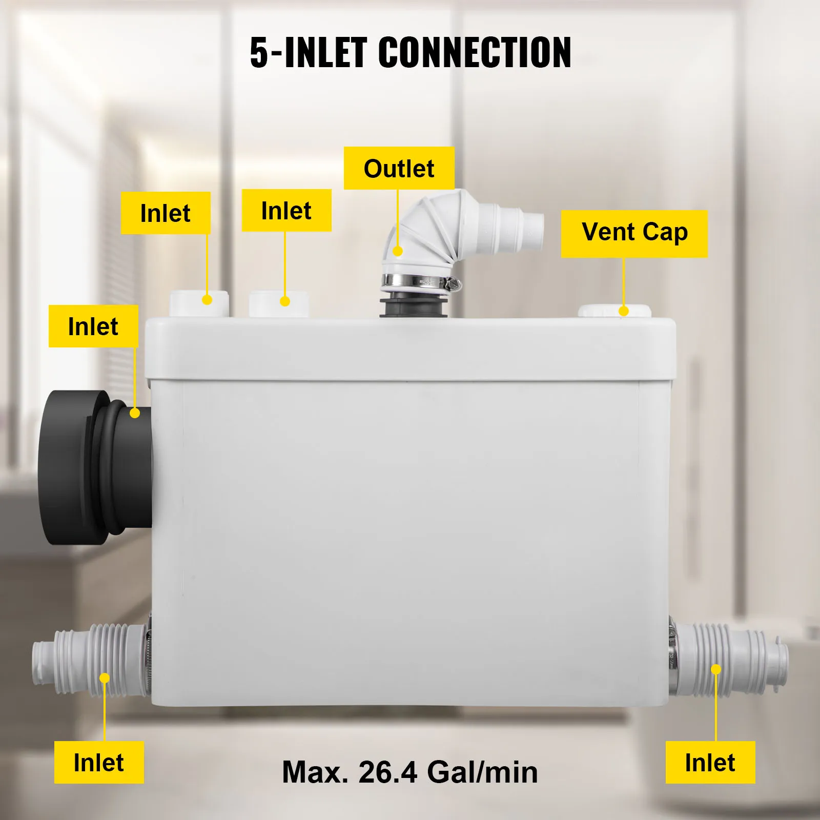 • Convenientes 5 entradas de agua: Máx. flujo: 26,4 gal/min (100 L/min). El inodoro triturador tiene 5 entradas para proporcionar la capacidad de conectar varios dispositivos, incluidos el lavabo, el inodoro, la ducha, la bañera, etc. Diámetro de entrada: 1,8" (46 mm); Diámetro de salida: 1,6" (40 mm). Temperatura del agua: 34-95 ℉ (1-35 ℃). (1 entrada está en el lateral de la máquina).