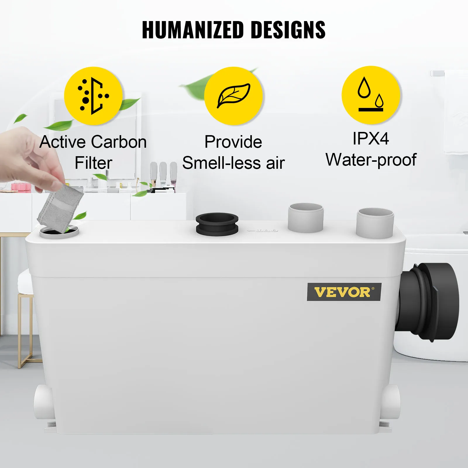 Nuestra bomba trituradora para inodoro tiene un respiradero con filtración de carbón activado, que purifica el aire de la bomba sin contaminación para su entorno de vida fresco y limpio.