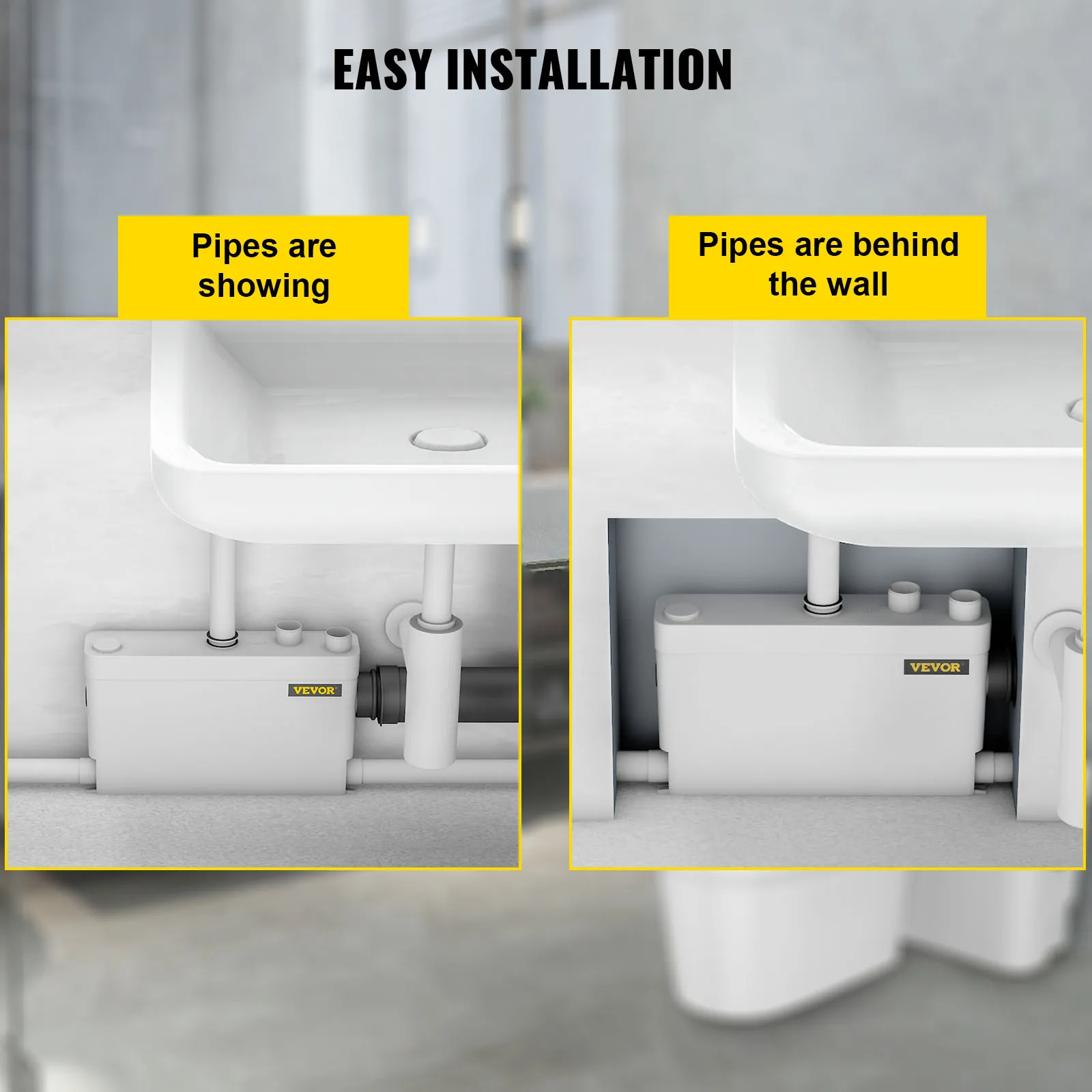 • Instalación en todas partes: Instale fácilmente el triturador sanitario sin problemas con los accesorios completos que le proporcionamos. Puede elegir la instalación empotrada o expuesta según sus necesidades. Perfecto para bombear los residuos de inodoros, lavabos, lavavajillas, duchas, bañeras, lavadoras en sótanos, áticos, casas de piscinas, instalaciones de fabricación, etc.