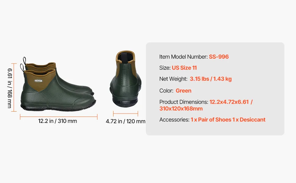 Varios tamaños disponibles: Estas botas de goma vienen en tamaños del 9 al 13, para satisfacer las distintas necesidades de los hombres. Consulta atentamente la tabla de tallas antes de seleccionar la talla adecuada para un calce cómodo