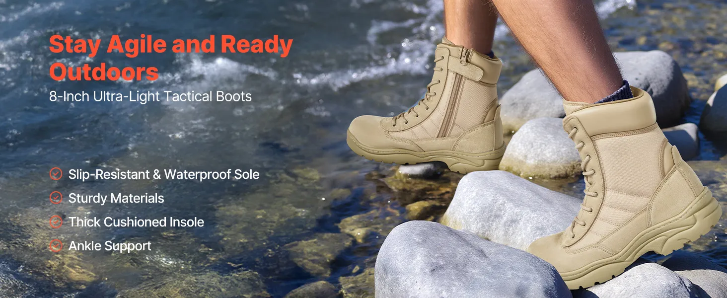 VEVOR Botas Tácticas Militares Hombre, 203 mm, de Cuero y Tela Oxford 1000D, Ligeras y Transpirables, con Cremallera Lateral, para Motociclista, Seguridad al Aire Libre, Talla 12 EE. UU., Arena