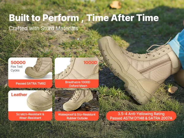 Ligeras y transpirables: Fabricadas con cuero de alta calidad y tela Oxford 1000D, estas botas de combate para hombre son resistentes a la abrasión y transpirables, manteniendo los pies frescos y secos durante largos períodos, con costuras triples para mayor durabilidad
