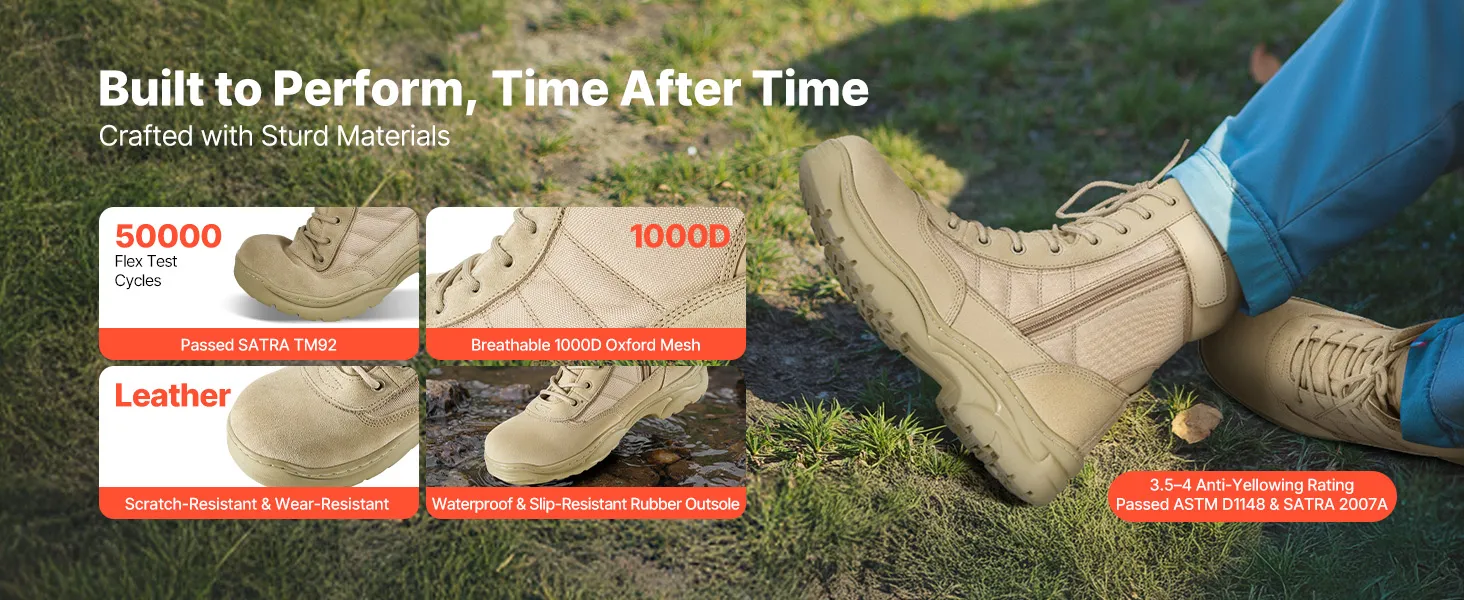 Soporte completo para el tobillo: Con un diseño de caña alta de 203 mm, estas botas de combate ofrecen soporte y protección total para el tobillo. La cremallera lateral YKK facilita su uso, ahorrando tiempo, mientras que sus 8 pares de ojales con una tensión de ≥40 kgf superan la prueba SATRA TM149 de cordones seguros