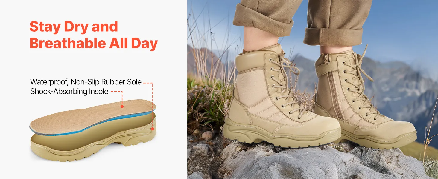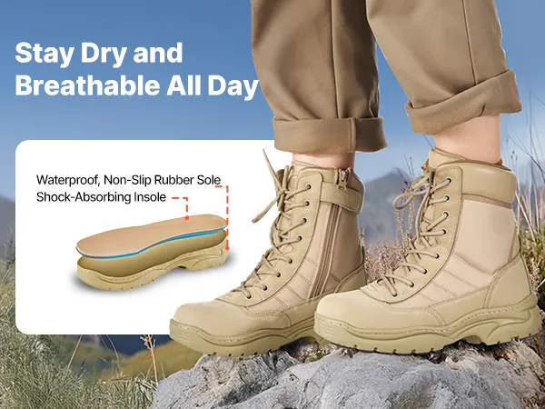 Plantilla acolchada: Con una plantilla extraíble y engrosada que absorbe los impactos y ofrece un soporte suave, estas botas de trabajo tácticas reducen la fatiga del pie. La plantilla transpirable mantiene el interior fresco y es fácil de limpiar y reemplazar