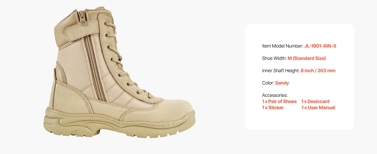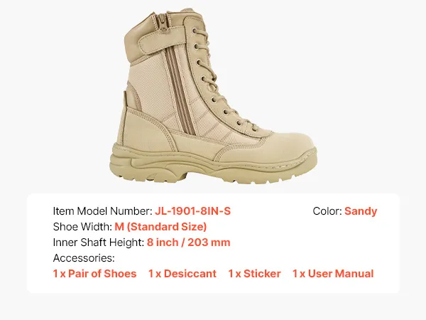 Soporte completo para el tobillo: Con un diseño de caña alta de 203 mm, estas botas de combate ofrecen soporte y protección total para el tobillo. La cremallera lateral YKK facilita su uso, ahorrando tiempo, mientras que sus 8 pares de ojales con una tensión de ≥40 kgf superan la prueba SATRA TM149 de cordones seguros