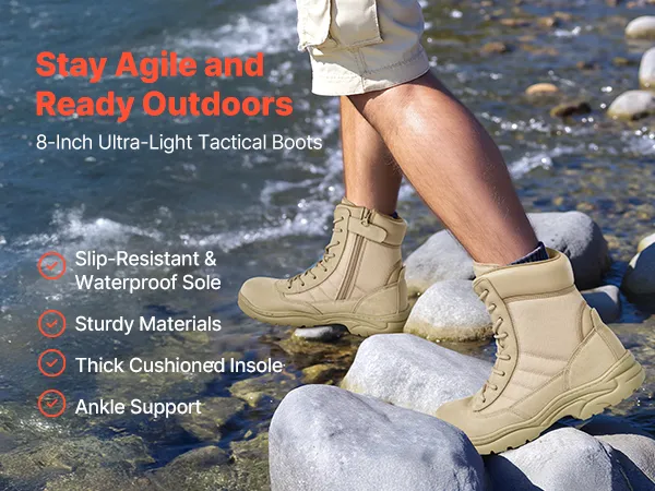 VEVOR Botas Tácticas Militares Hombre, 203 mm, de Cuero y Tela Oxford 1000D, Ligeras y Transpirables, con Cremallera Lateral, para Motociclista, Seguridad al Aire Libre, Talla 9 EE. UU., Arena