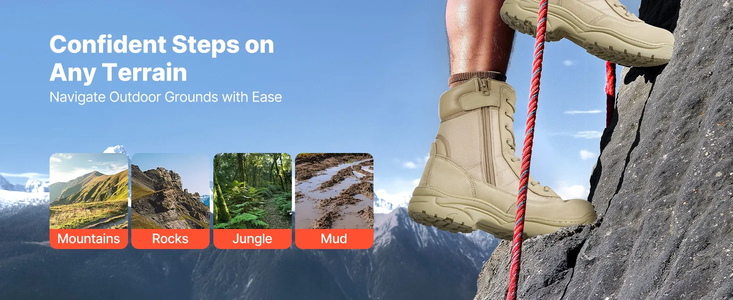 Plantilla acolchada: Con una plantilla extraíble y engrosada que absorbe los impactos y ofrece un soporte suave, estas botas de trabajo tácticas reducen la fatiga del pie. La plantilla transpirable mantiene el interior fresco y es fácil de limpiar y reemplazar