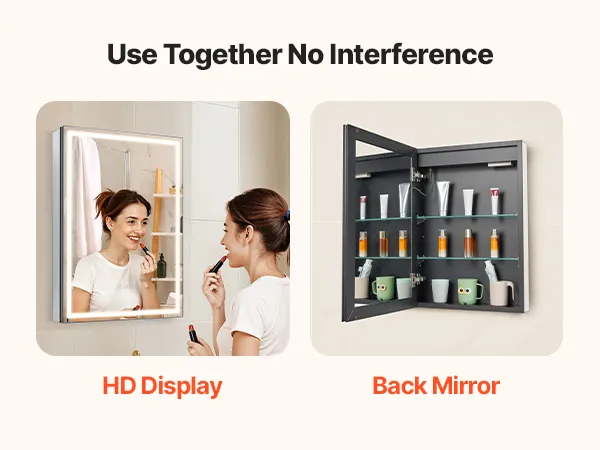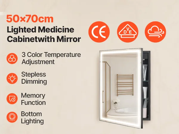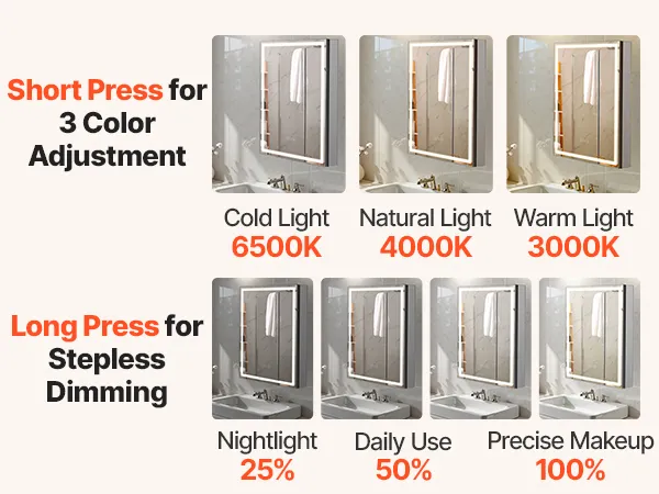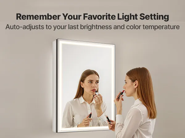 Este armario con espejo LED ofrece una luz de alto brillo para maquillarse y una luz cálida de bajo brillo para un baño suave por la noche. La función de memoria recupera automáticamente la última configuración de brillo.