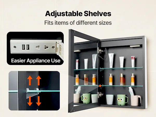 Toma de corriente incorporada conveniente: El armario con espejo iluminado está equipado con una toma de corriente incorporada que incluye dos tipos de salidas, exclusivamente para alimentar máquinas de afeitar, lo que ofrece una mayor comodidad para el uso diario