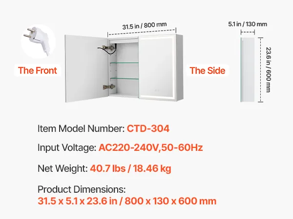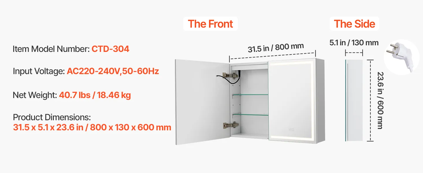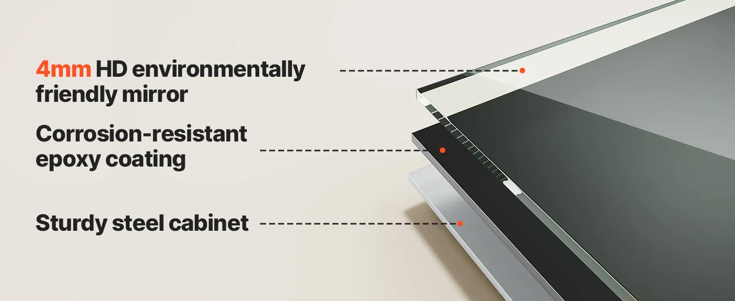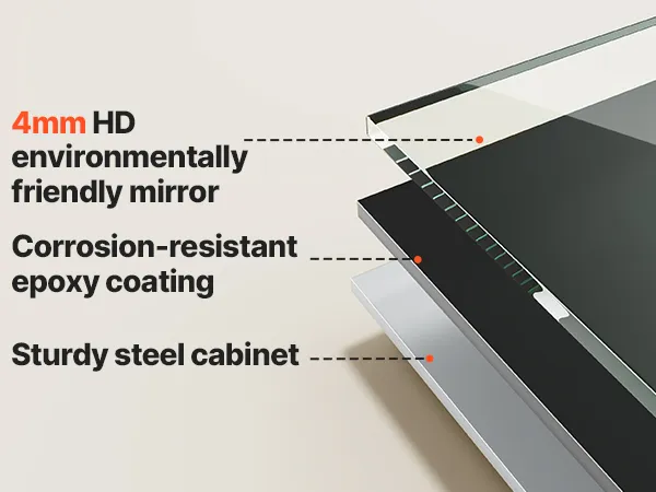 Espejo de alta definición: El gabinete con espejo LED cuenta con un espejo de alta definición de 4 mm que ofrece reflejos nítidos y sin distorsiones. El revestimiento epóxido previene la decoloración, la corrosión y los daños causados por el agua, garantizando una mayor durabilidad y una experiencia duradera