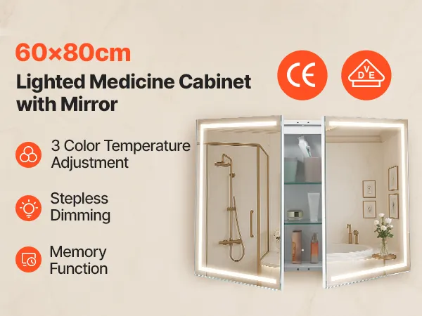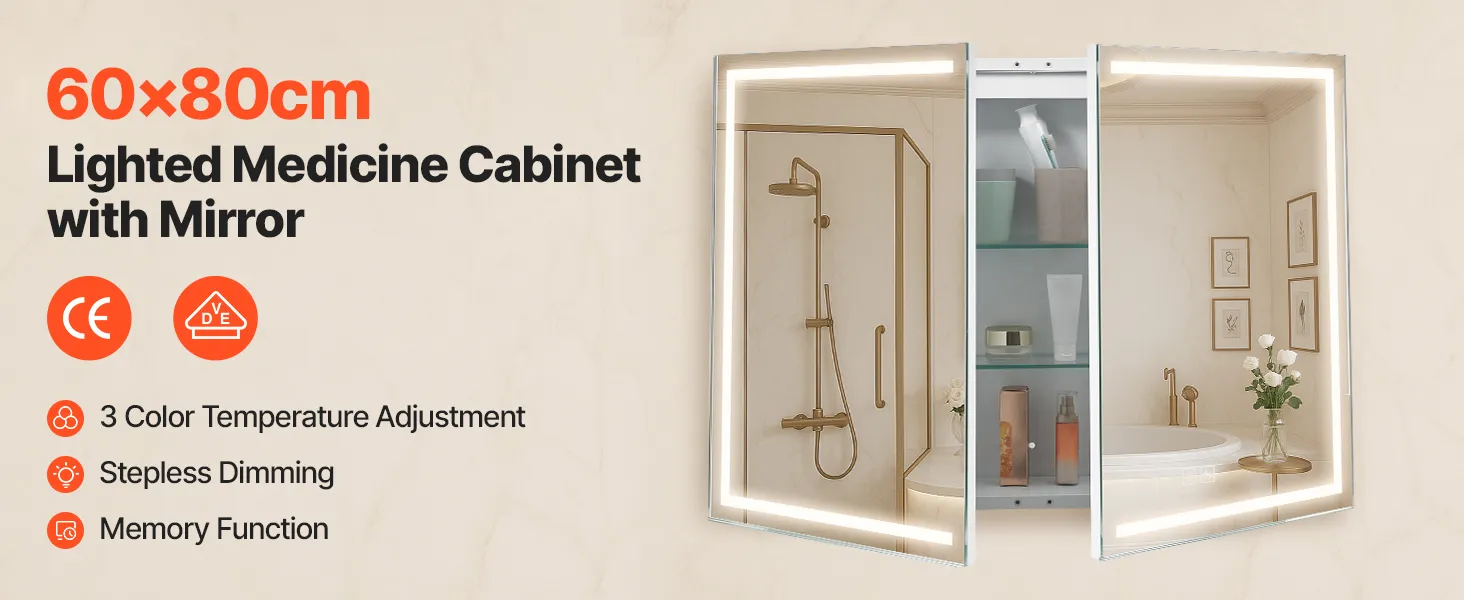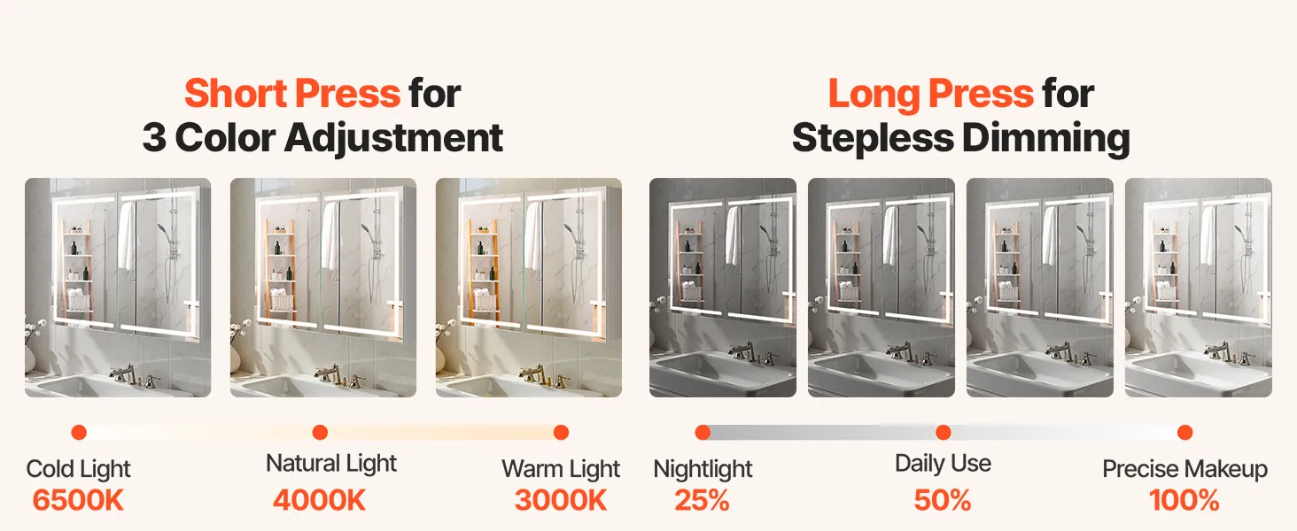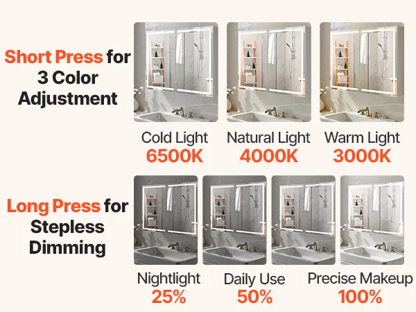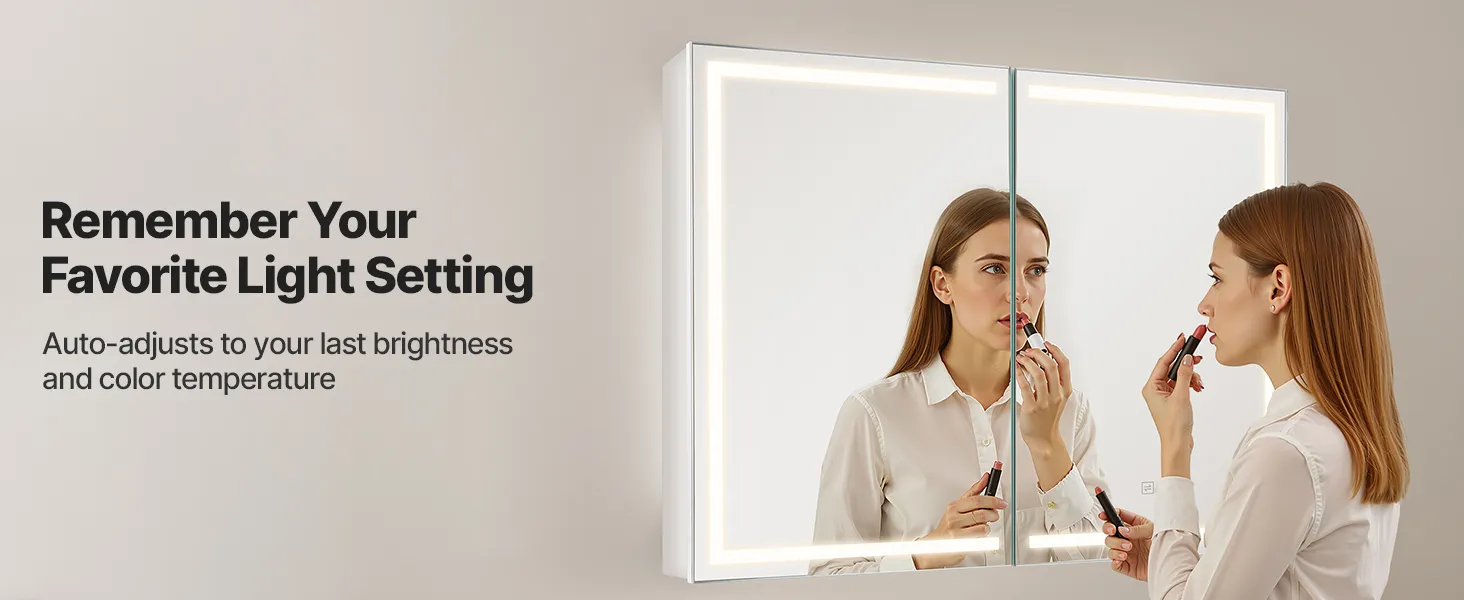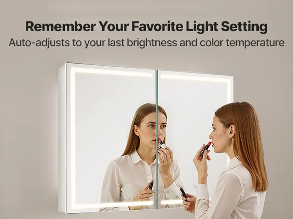 Este armario con espejo LED ofrece una luz de alto brillo para maquillarse y una luz cálida de bajo brillo para un baño suave por la noche. La función de memoria recupera automáticamente la última configuración de brillo.