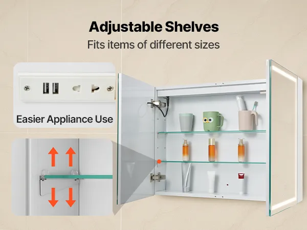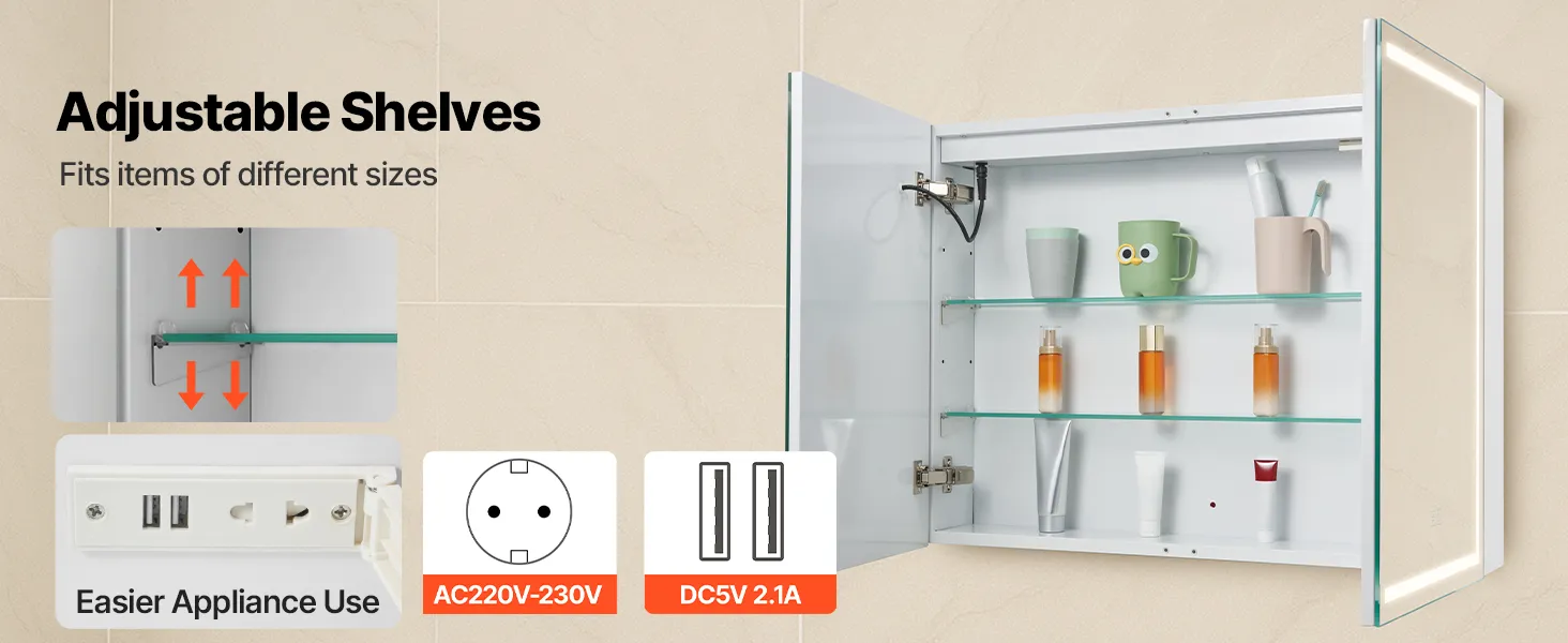 Toma de corriente incorporada conveniente: El armario con espejo iluminado está equipado con una toma de corriente incorporada que incluye dos tipos de salidas, exclusivamente para alimentar máquinas de afeitar, lo que ofrece una mayor comodidad para el uso diario