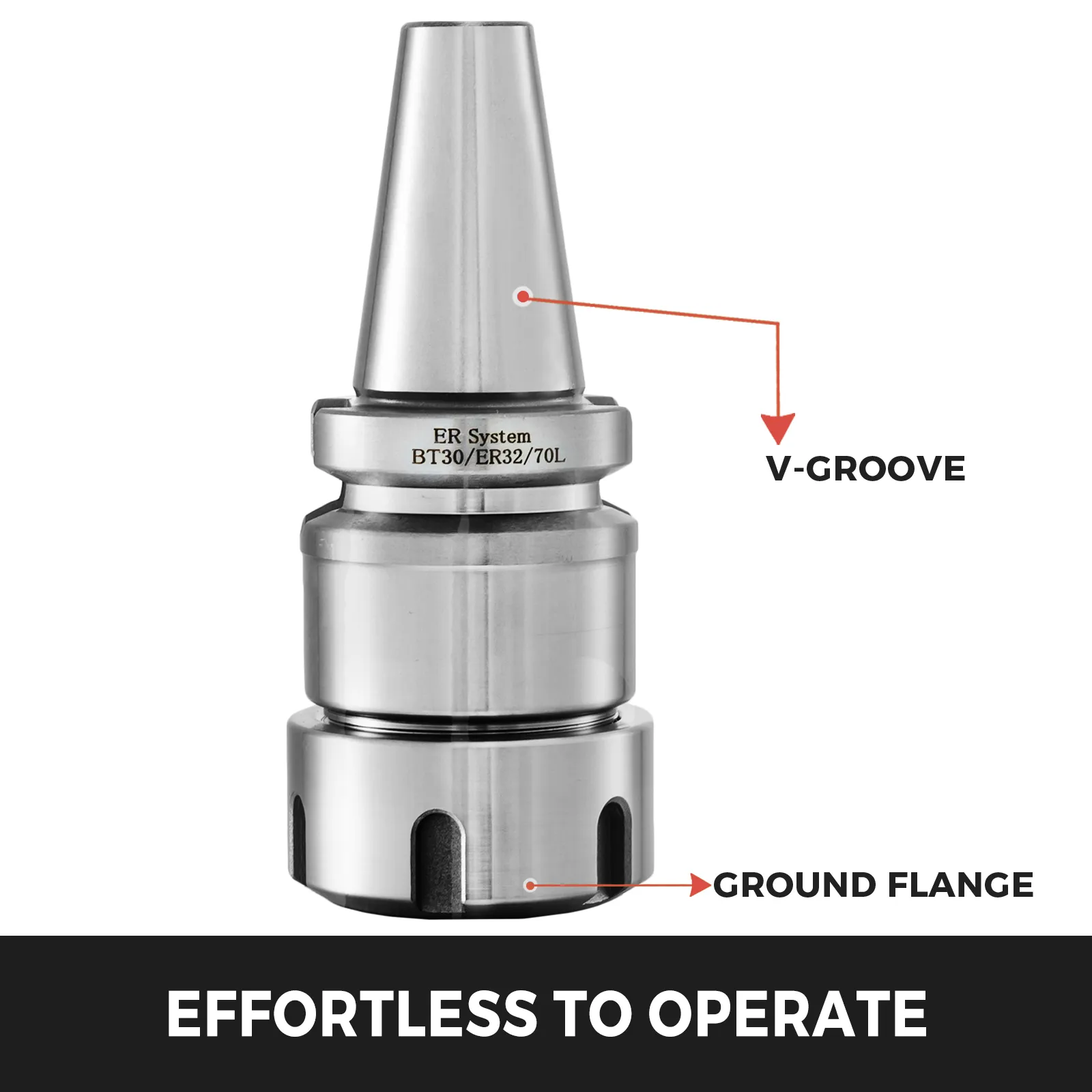 【OPERACIÓN FÁCIL】- 1 piezas de portabrocas de precisión BT30. Fácil de usar, más seguro que el modelo de vástago separado. La brida totalmente rectificada y la ranura en V hacen que sea fácil para los cambiadores de herramientas, lo que reduce el mantenimiento del cabezal y del cambiador.