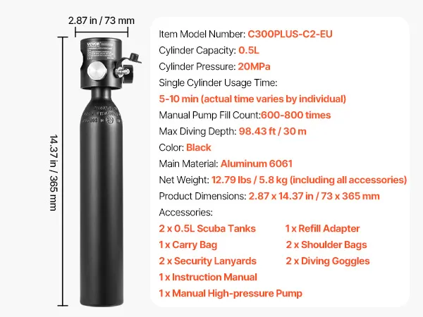 VEVOR Tanque de Buceo Portátil de 0.5 L, con Bomba para Buceo, Permite Respirar bajo el Agua de 5 a 10 Minutos, Profundidad de 30 m, Recargable, para Exploración Submarina, Aluminio 6061, Negro