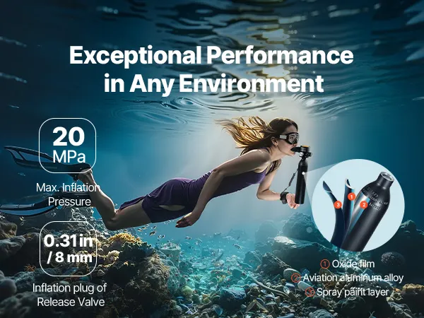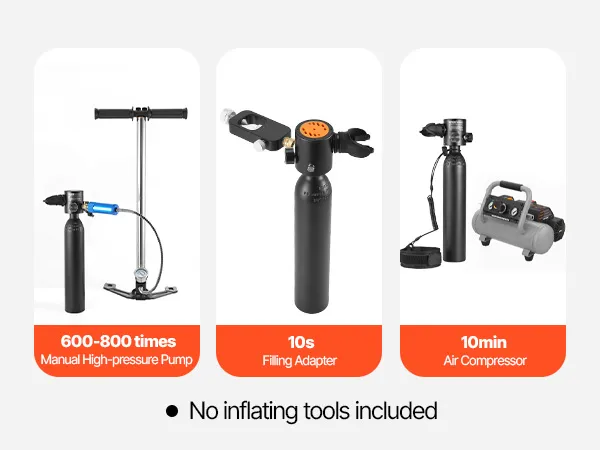 Tres opciones de inflado: Nuestro kit de tanque de buceo incluye una bomba manual de alta presión y un adaptador adicional para inflarlo cómodamente en cualquier lugar. También puede usar un compresor de aire para recargas rápidas