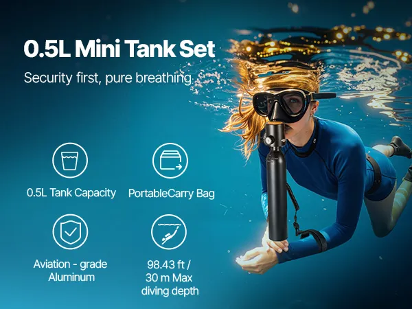 Este mini tanque de buceo de 0.5 L ofrece de 5 a 10 minutos de inmersión, ideal para principiantes y buceadores recreativos. Una excelente introducción al mundo submarino.